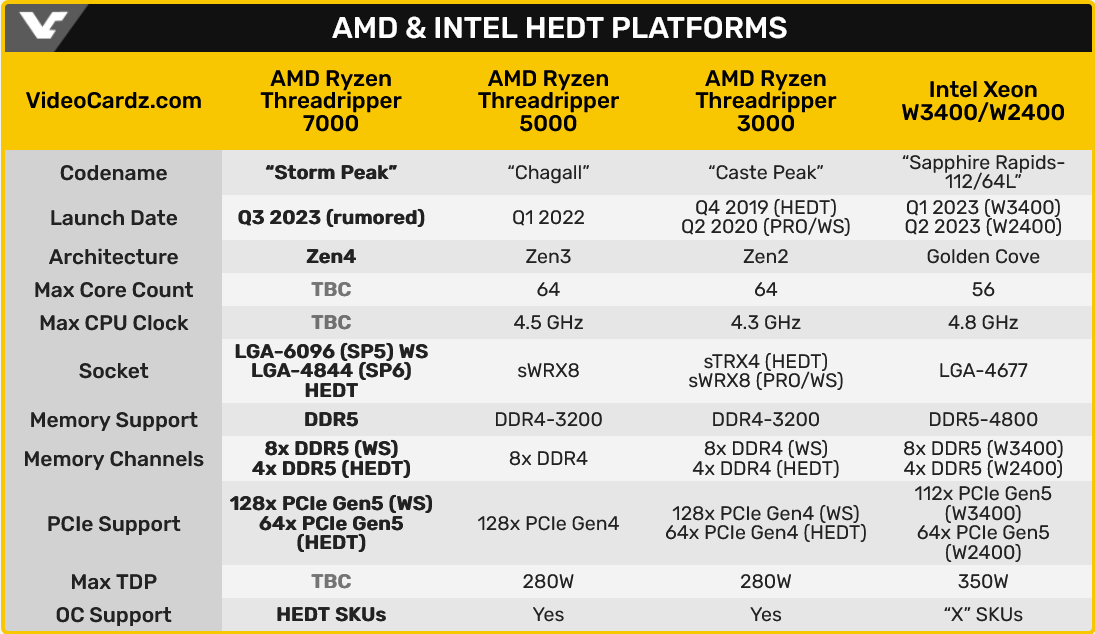 새로운 플랫폼은 DDR5 메모리 및 PCIe Gen5 인터페이스와 같은 최신 기술을 사용하는 LGA6096(PRO) 또는 LGA4844(HEDT) 소켓을 활용해야 합니다. 클럭 또는 최대 TDP와 같은 세부 정보는 아직 알려지지 않았습니다.