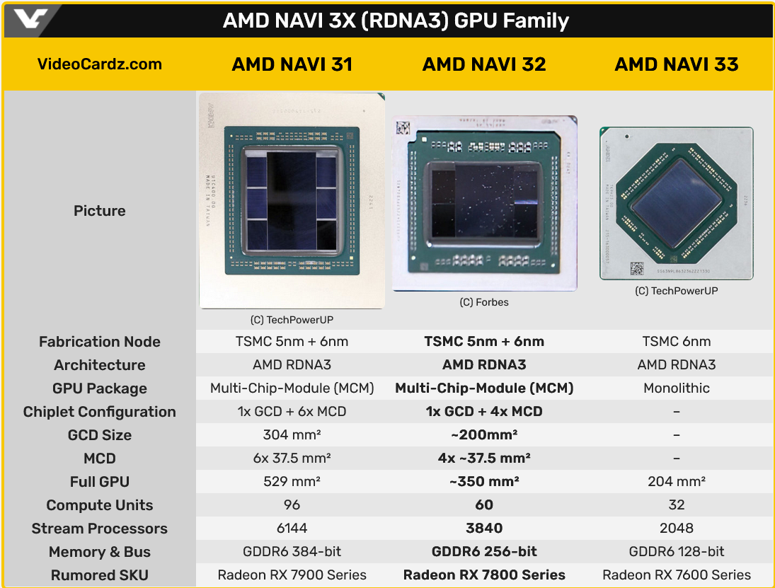 아시다시피 AMD는 RDNA3 아키텍처용으로 Navi 31, Navi 32 및 Navi 33의 세 가지 그래픽 카드를 계획하고 있습니다. 첫 번째 프로세서는 이미 작년 말부터 Radeon RX 7900 하이엔드 데스크톱 시리즈에 배치되었으며 Navi 33은 이제 막 출시되었습니다. Radeon RX 7600 그래픽 카드의 형태로 노트북 및 데스크탑용으로 도입되었습니다.