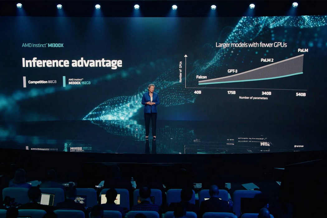 AMD 인스팅트 MI300X의 성능은 400억 개의 매개변수로 구성된 팔콘-40과 같은 대형 언어 모델을 단일 가속기로 수용할 수 있다. 행사 중에는 MI300X로 연결된 생성형 AI에 시를 주문하는 시연도 진행됐다. 이외에도 AMD는 데이터 센터 가속기를 위한 ROCm 소프트웨어 생태계 구축을 위한 협력 방안과 AI 구축 플랫폼 허깅페이스에 AMD 인스팅트 가속기, 라이젠 및 에픽 프로세서, 라데온 GPU, 버설, 알베오 등을 비롯한 AMD 제품군을 최적화한다는 내용도 발표했다. AMD 인스팅트 MI300A는 현재 기술 시험 단계인 샘플링 중에 있으며, 고성능 모델인 MI300X는 3분기 중 샘플링에 들어간다.