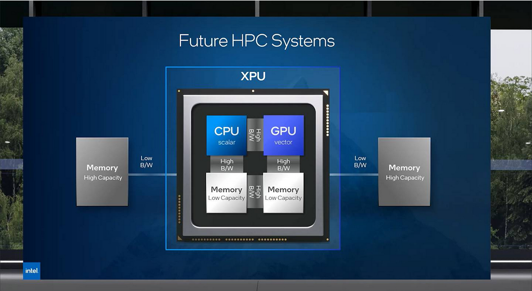 인텔은 2018년부터 GPU 자체 제작을 시작해, 21년부터 소비자용 그래픽 카드를 비롯한 GPU 제품을 내놓고 있다. 다만 서버용 시장에 대응하는 GPU는 이제 막 걸음마를 뗀 상황이다. 인텔은 지난 2021년 인텔 아키텍처 데이에서 Xe-HPC (코드명 폰테 베키오) 라인업의 제품 정보를 공개했으며, 올해 1월에 들어서야 인텔 데이터센터 GPU 맥스 시리즈라는 이름으로 제품을 공개했다. 인텔 데이터센터 GPU 맥스는 47개의 타일을 단일 구성으로 결합한 형태의 GPU로, 최대 128GB의 HBM 메모리와 128개의 Xe 코어로 구성된다.