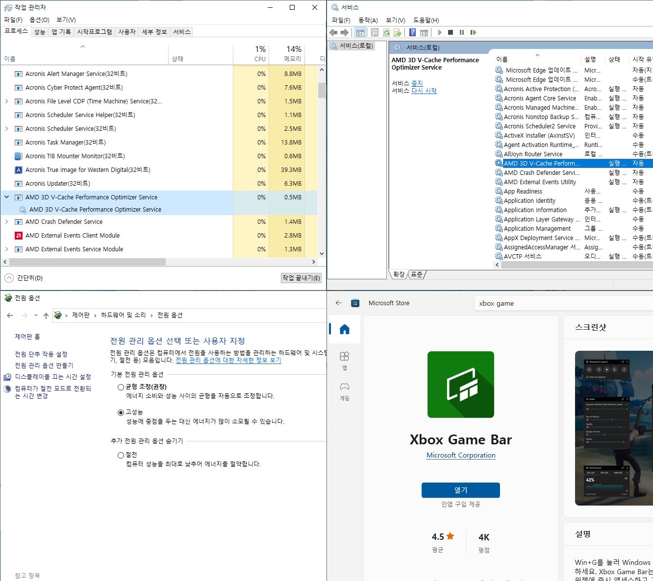 전원 옵션에서 고성능을 설정하고, 마이크로소프트 스토어에서 Xbox Game Bar 최신 버전을 설치합니다.