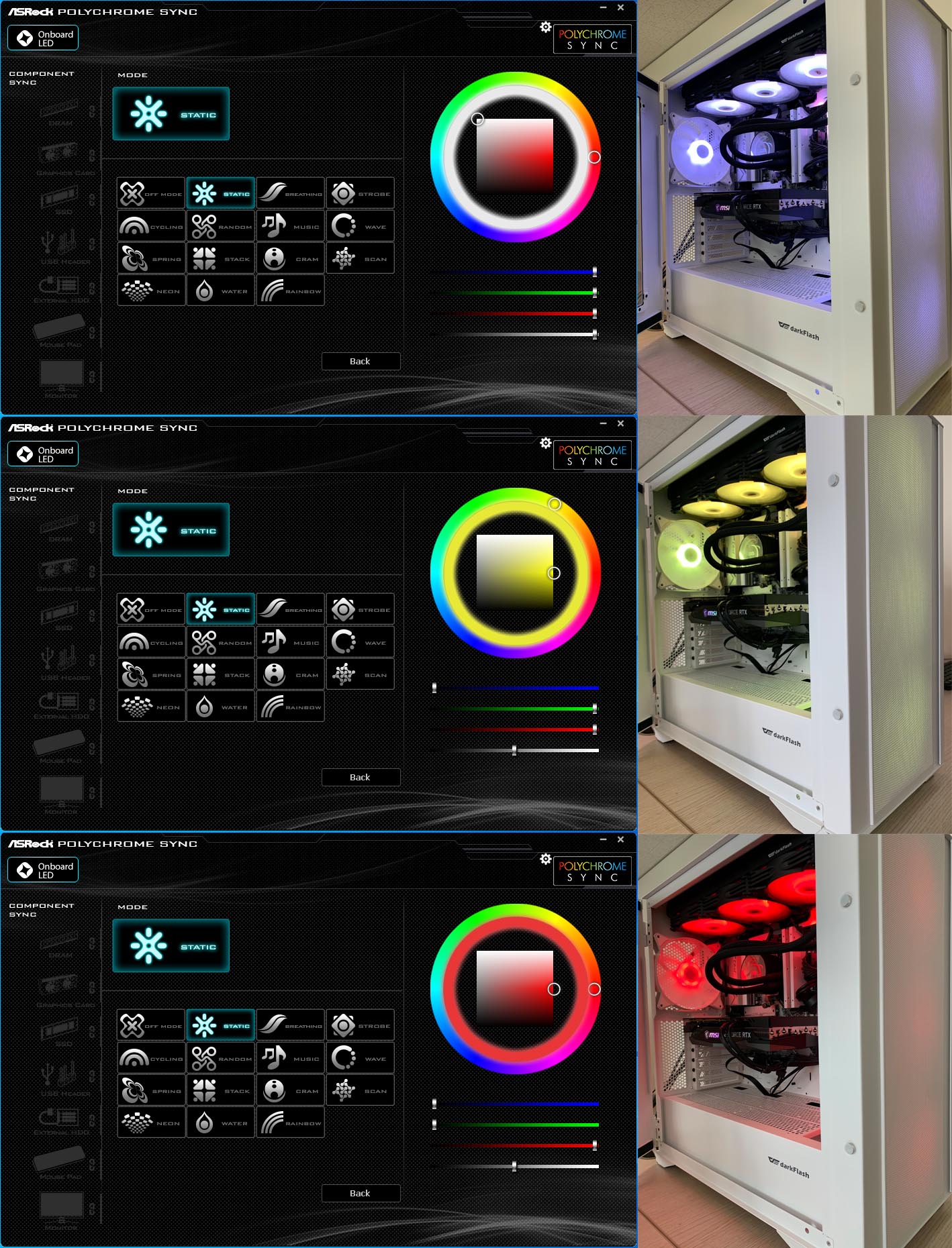 화이트 색상의 PCB와 히트싱크로 화이트 시스템에 잘 어울리는 디자인과, 직관적인 UI로 제작된 전용 소프트웨어 ASRock Polychrome RGB 툴로 시스템 LED를 다양하고 멋지게 꾸밀 수 있었습니다.