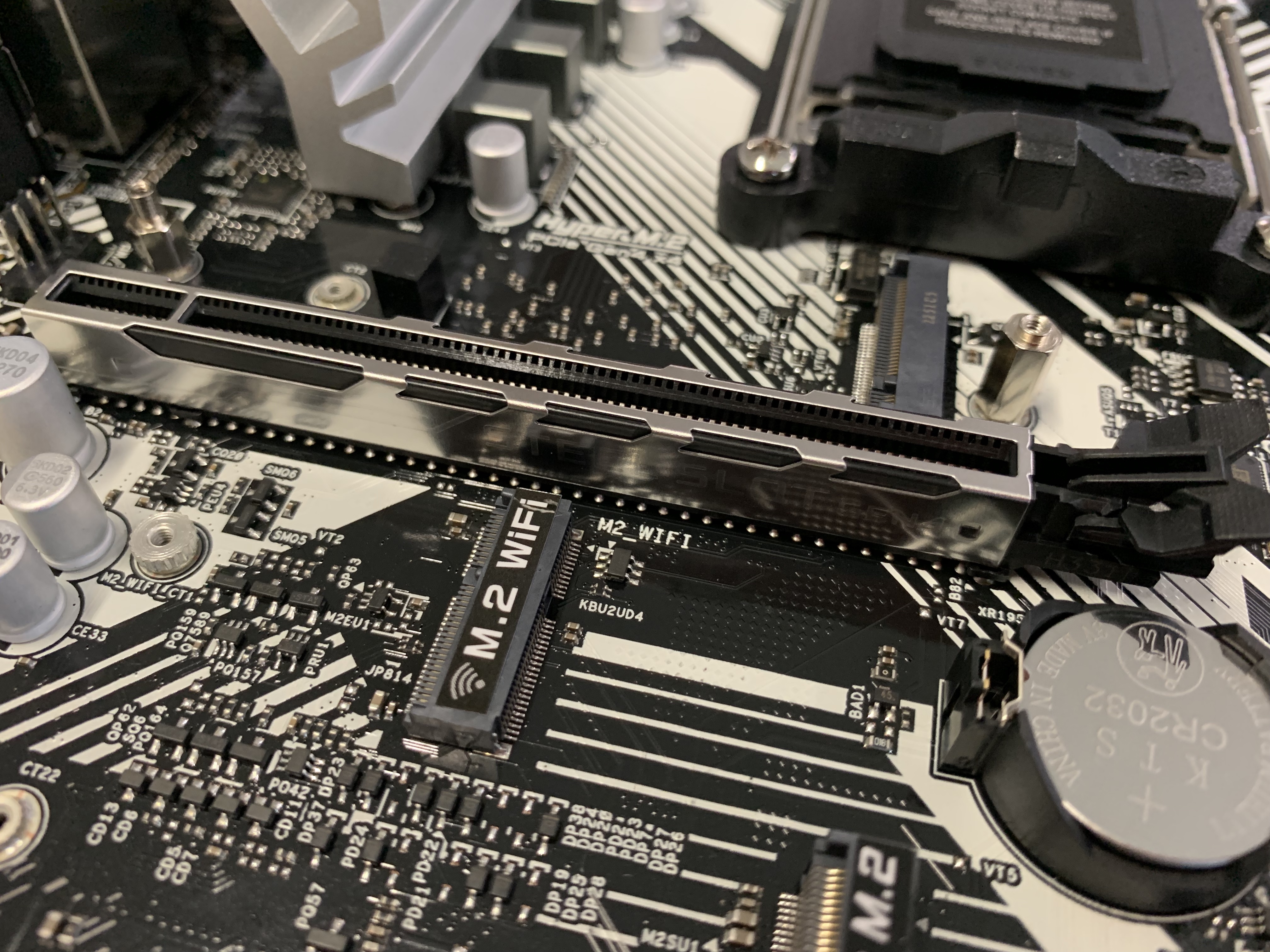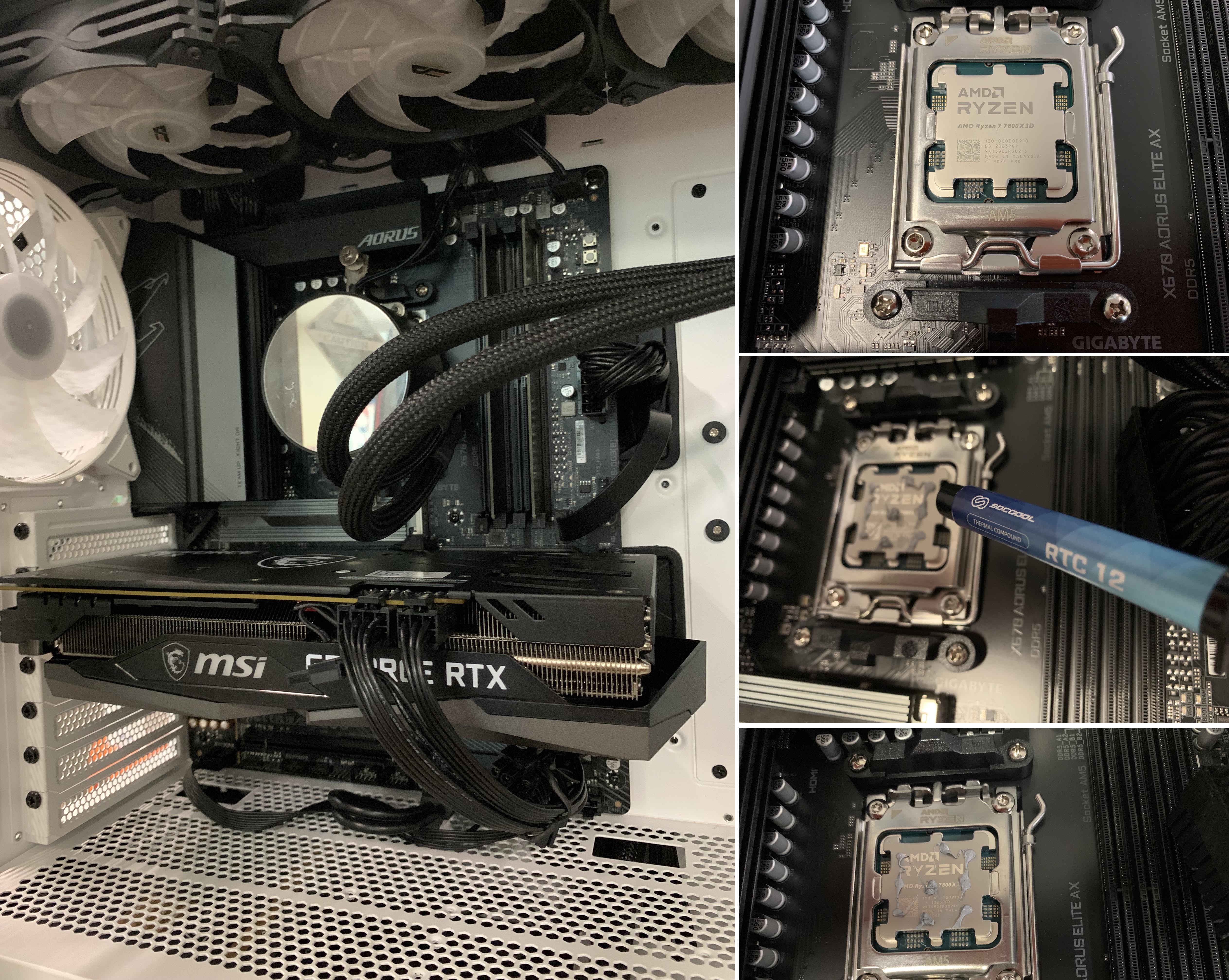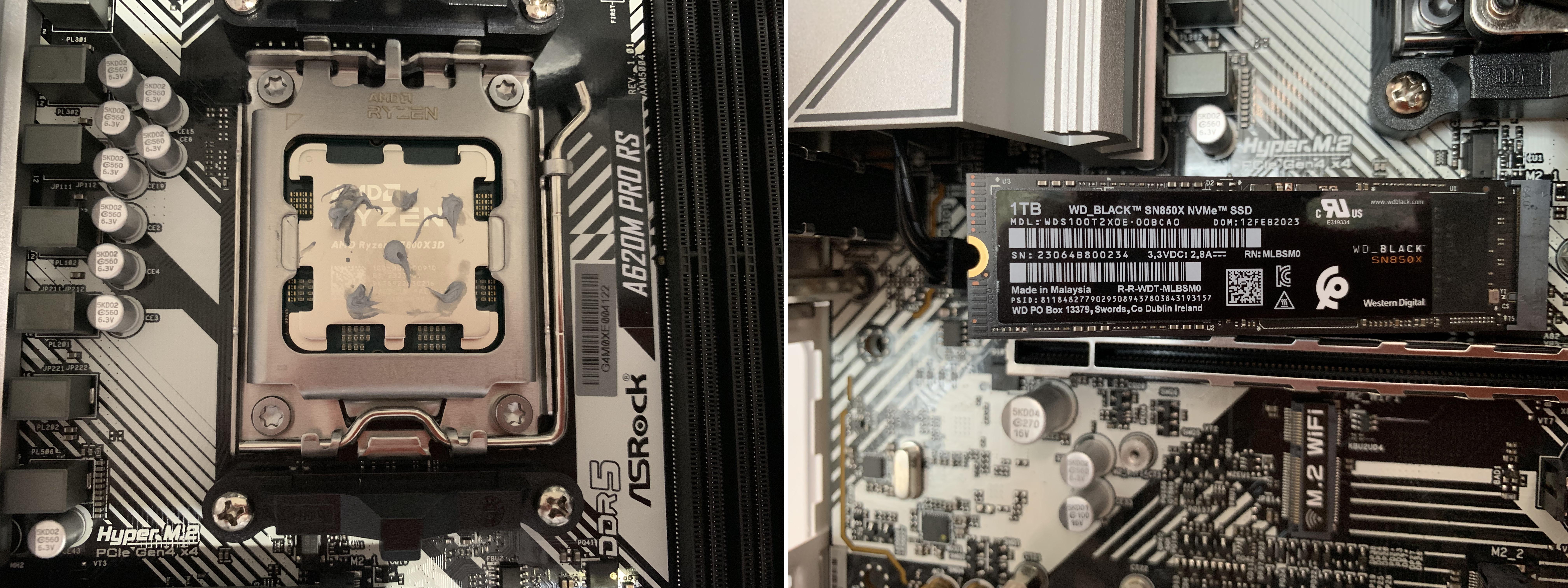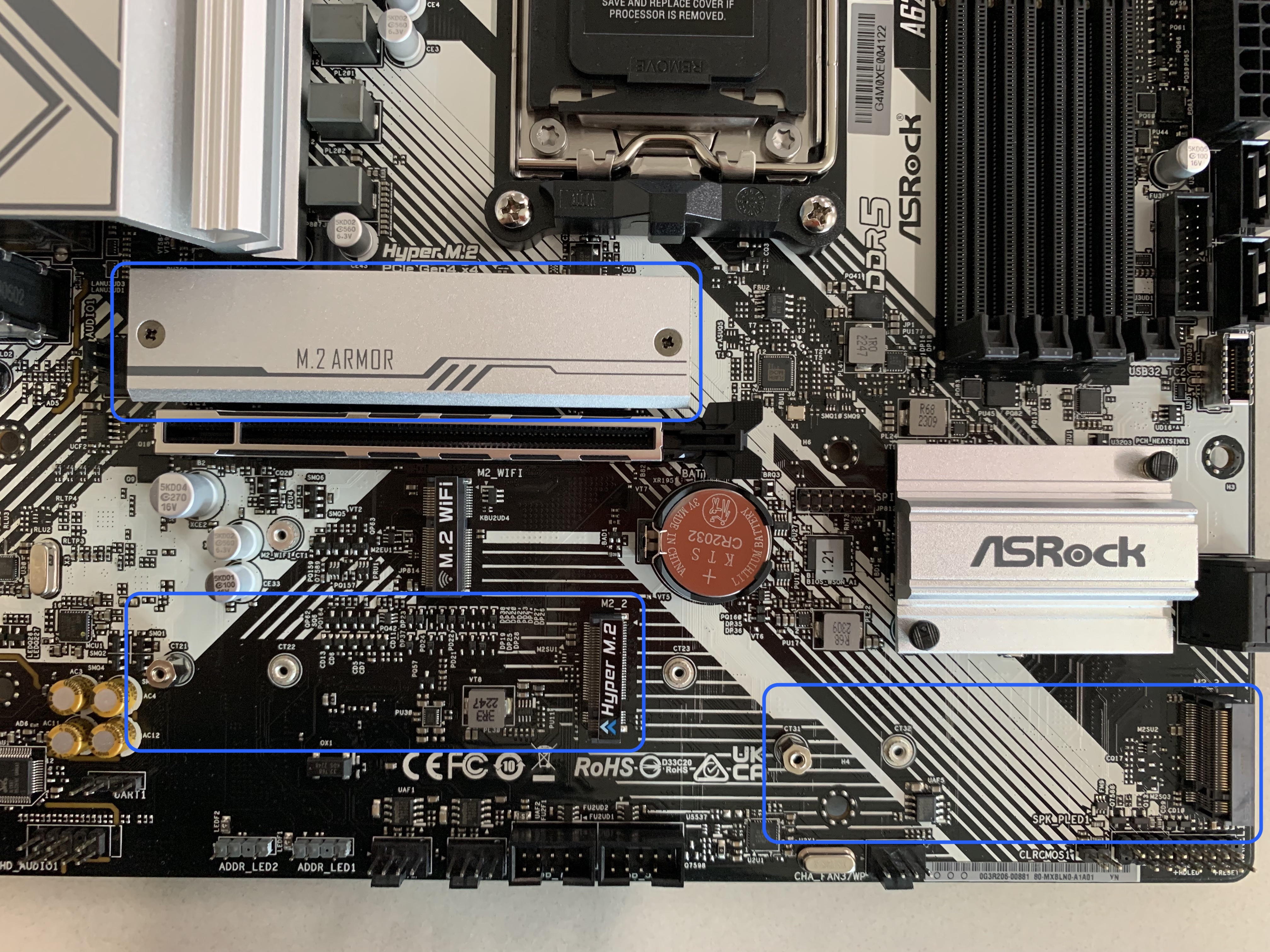써멀 구리스는 가운데 큰 점과 테두리는 작은 점으로 도포했으며, M.2 NVMe SSD는 히트싱크가 있는 슬롯에 장착했습니다.