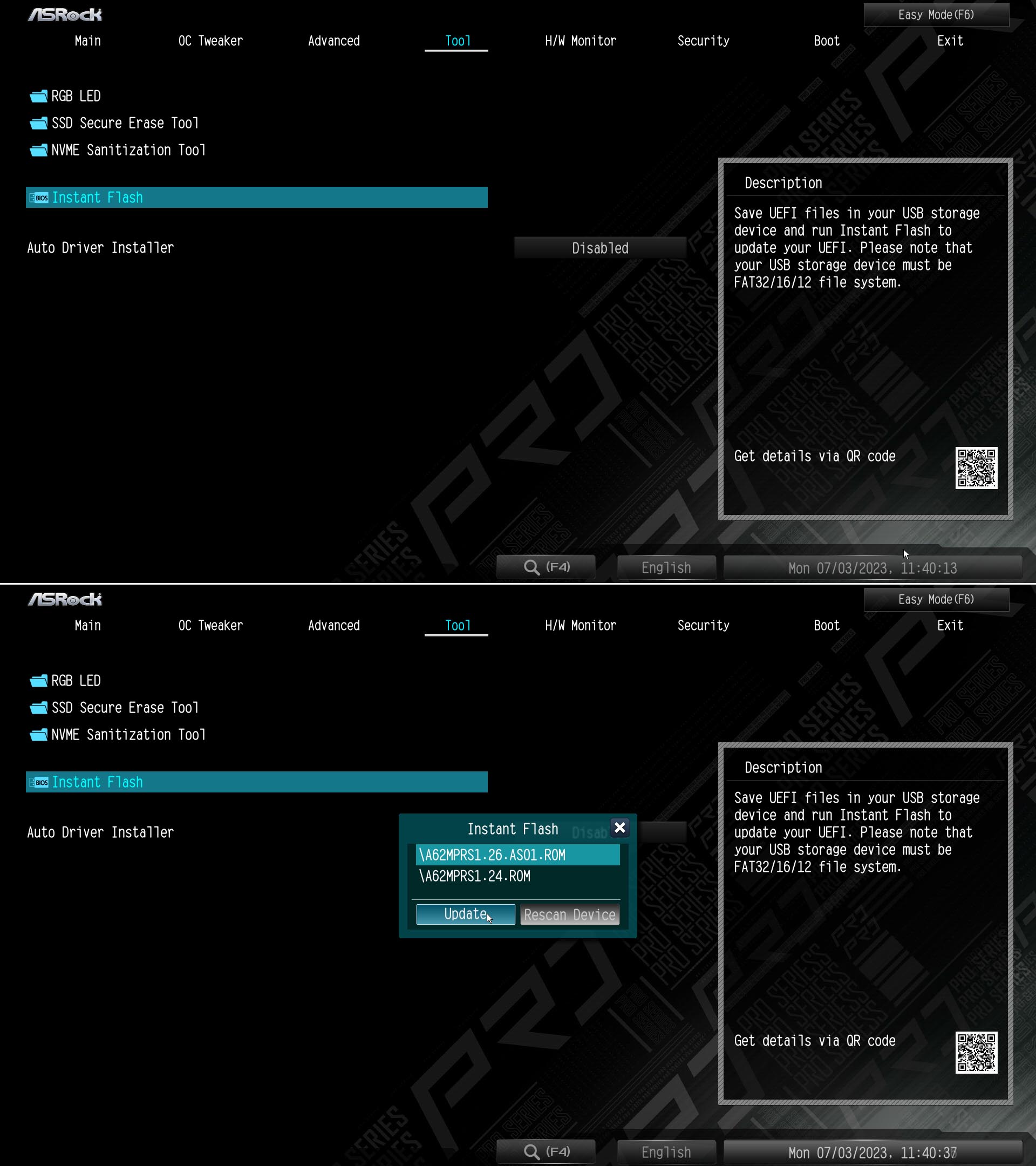 바이오스에서 진입하여 Instant Flash에서 업데이트를 진행하면 됩니다.