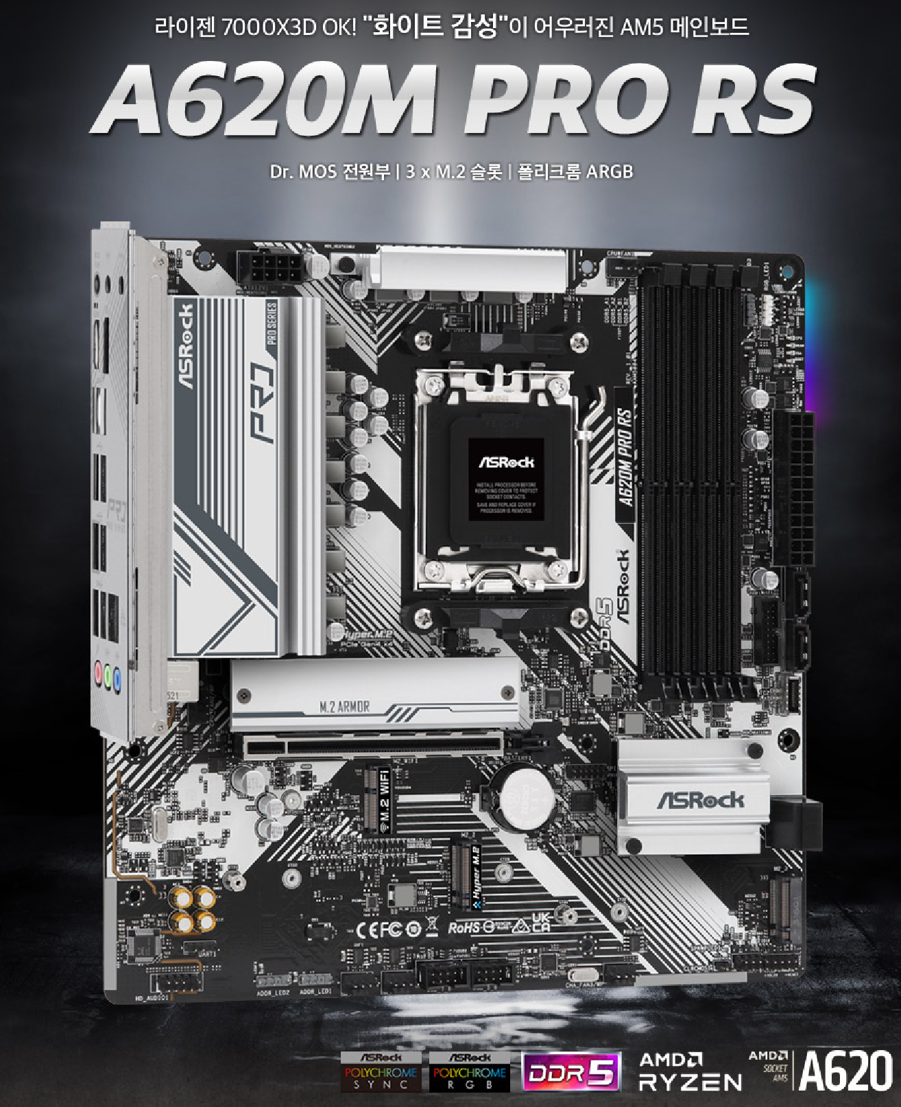 보급형 메인보드지만 고급형 메인보드에 뒤지지 않는 고급 디자인, 고성능, 우수한 확장성을 보유하고 보급형 CPU부터 고성능 CPU 까지 모두 소화 가능한 초가성비 메인보드 ASRock A620M PRO RS 적극 추천합니다.