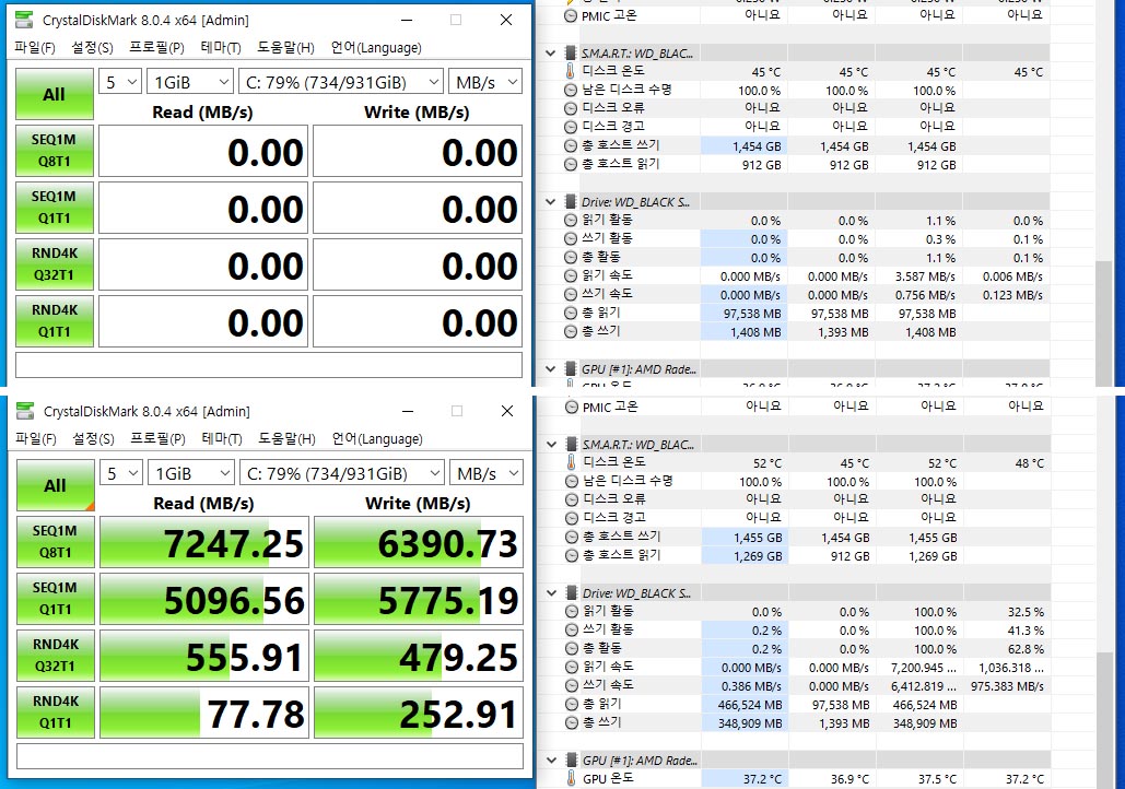 WD BLACK SN850X SSD 1T 제품의 스펙 100% 성능이 나오는 모습니다.
