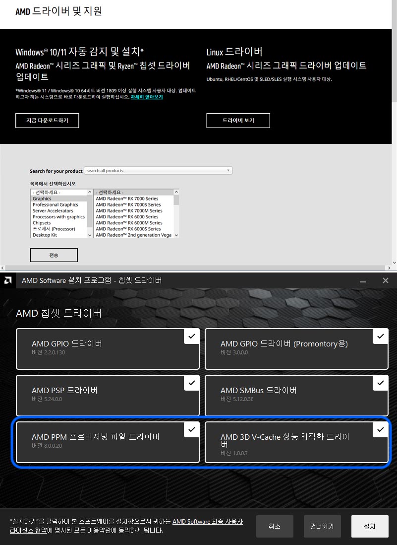 윈도우에서 칩셋 드라이버를 설치합니다.(AMD PPM 프로비저닝 파일 드라이버, AMD 3D V-Cache 성능 최적화 드라이버를 반드시 포함해서 설치하세요. 보이지 않는다면, 메인보드 바이오스 최신 버전으로 업데이트하세요.)