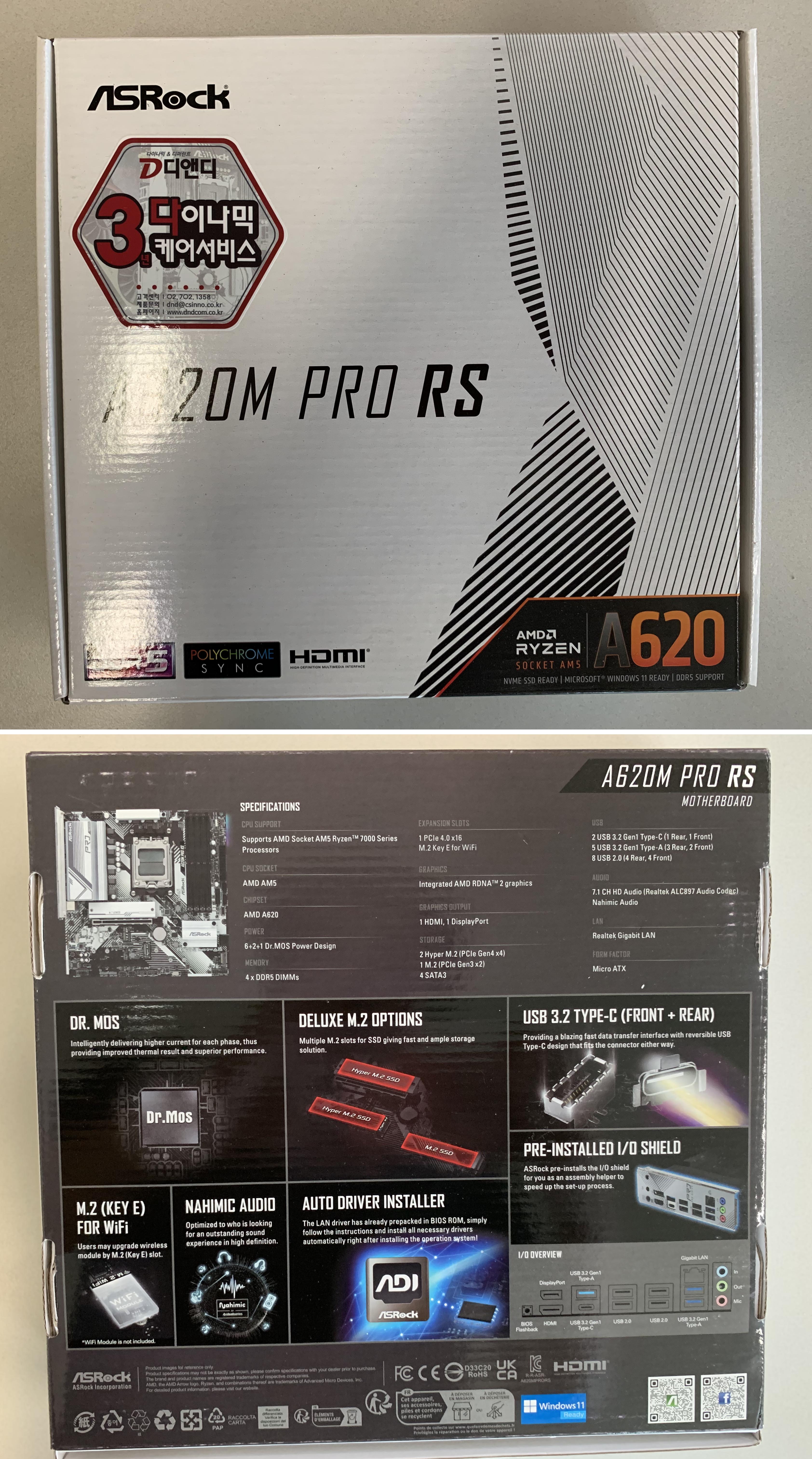 디엔디컴에서 3년 AS 보장 스티커가 붙어 있고, A620M PRO RS의 특징을 알 수 있습니다.
