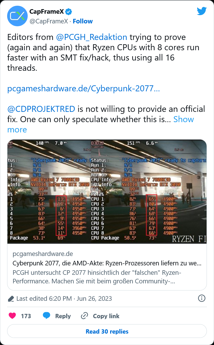 AMD Ryzen CPU SMT를 위한 비공식 Cyberpunk 2077 패치는 개발자가 문제가 해결되었다고 밝혔음에도 불구하고 최대 27%의 성능 향상을 제공합니다.