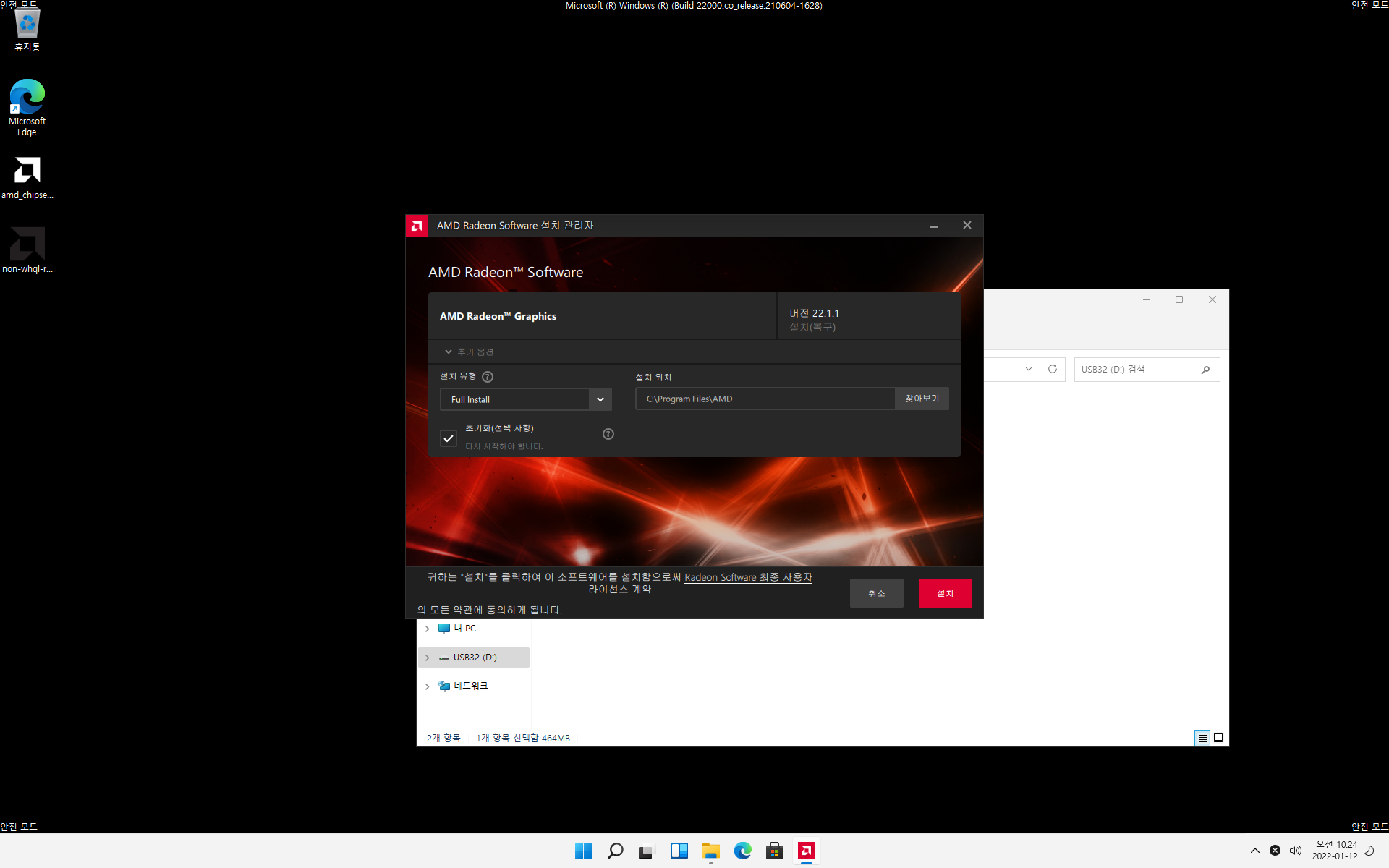 안전모드 화면에서 C:\AMD\Driver\setup.exe 파일 실행하고, 위 스크린샷처럼 설치유형에서 [초기화]를 체크하고 [설치]를 누르면 거짓말 처럼, 윈도우11이 부팅이 시작된다. 잘못 설치된 드라이버가 삭제된다.