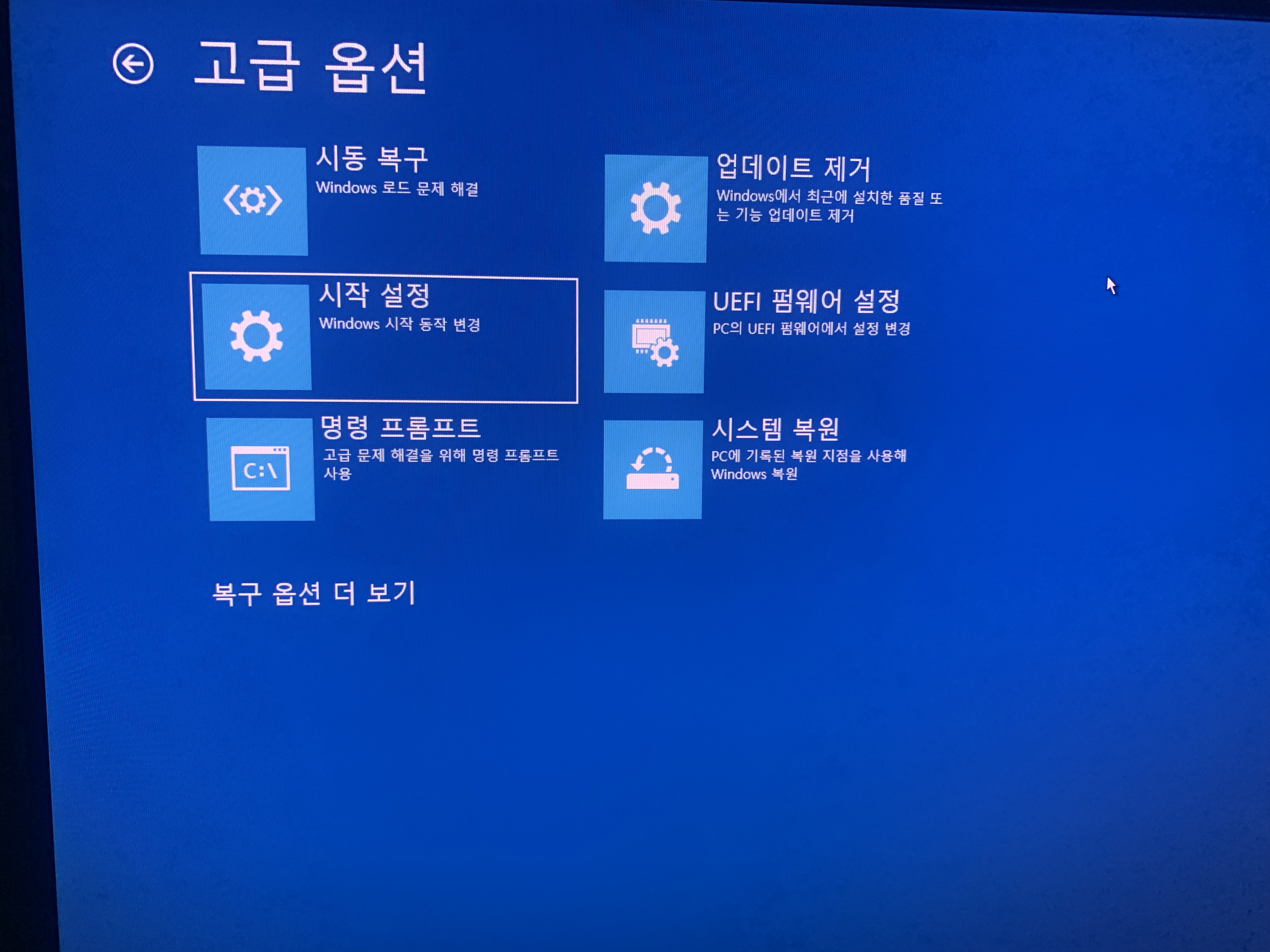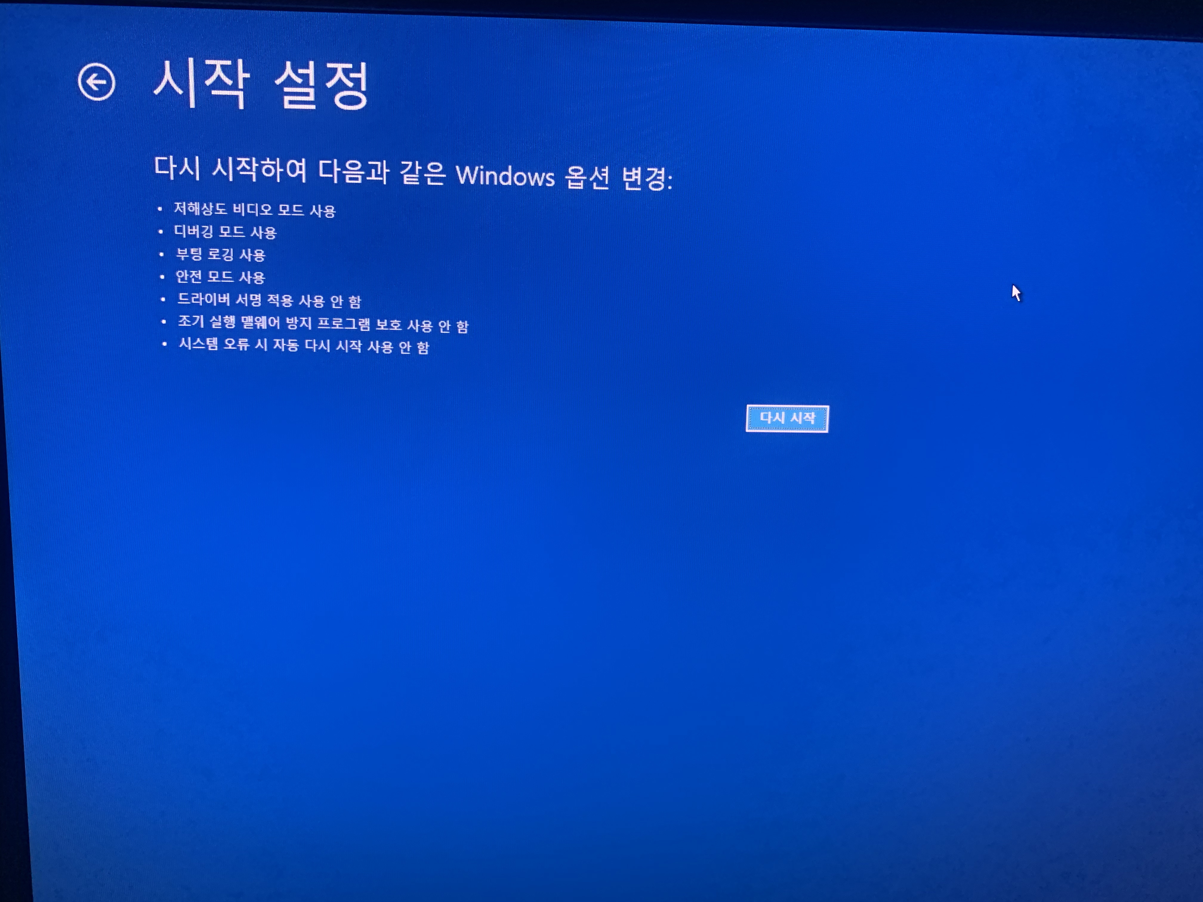 계속 리셋버튼을 눌러서 윈도우 부팅 여러번 실패하면, 이 화면이 뜬다. (안전모드에 가서, 설치실패한 드라이버 제거 하는 방법이다)