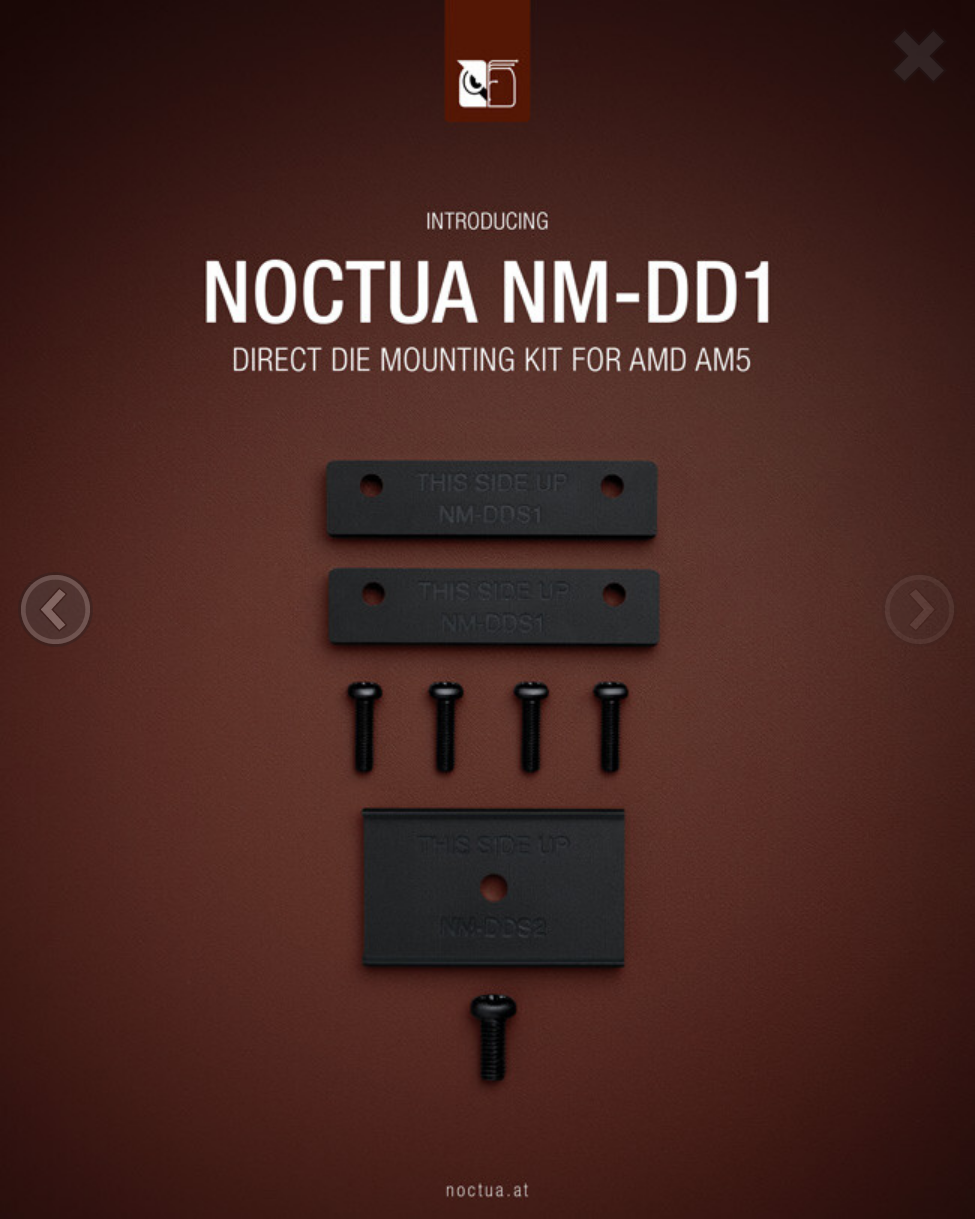 Noctua는 오늘 새로운 NM-DD1 다이렉트 다이 키트를 발표했습니다. 전문 오버클럭커이자 다이렉트 다이 쿨링 전문가인 Roman "der8auer" Hartung과 협력하여 개발한 NM-DD1은 삭제된 AMD AM5 프로세서에서 다양한 Noctua CPU 쿨러를 사용할 수 있게 해주는 마운팅 스페이서 키트입니다. 프로세서의 통합 열 분산기(제거)를 제거하고 히트싱크를 다이에 직접 배치하면 훨씬 더 효율적인 열 전달이 가능하므로 일반적으로 10-15°C 범위의 이득으로 CPU 온도를 크게 낮출 수 있습니다.