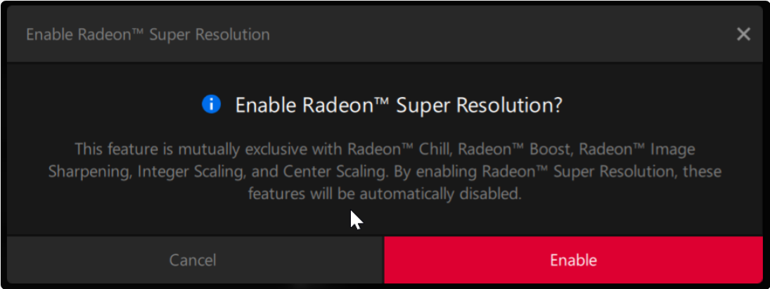 그러나 현재 모든 기능을 한 번에 활성화하는 것은 불가능합니다. 예를 들어 Radeon Super Resolution은 Radeon Boost에서 작동하지 않습니다. 두 기능은 상호 배타적이며 Radeon 소프트웨어에 메시지를 표시합니다. Radeon Boost 및 Anti-Lag에도 동일하게 적용되며 함께 작동하지 않습니다.