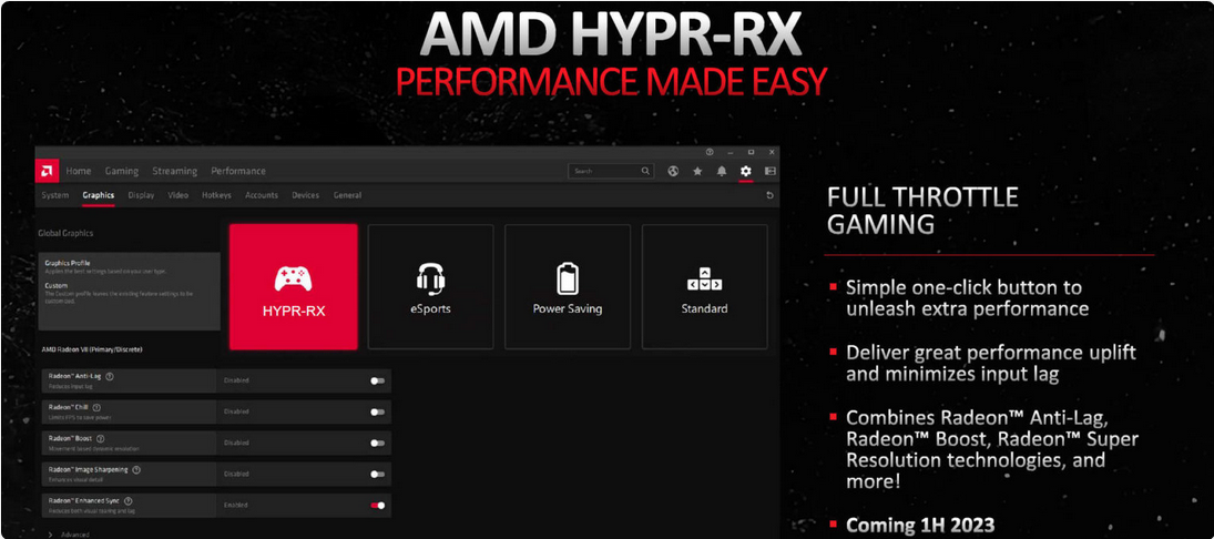 HYPR-RX는 성능과 응답성에 중점을 둔 세 가지 기술을 결합한 간단한 솔루션을 의미했습니다. AMD는 2023년 상반기에 HYPR-RX를 구현하기 쉬운 기능으로 보였지만 약속한 대로 출시하지 않았습니다.