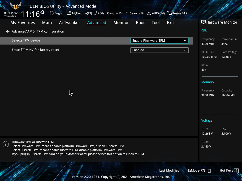 2. fTPM 설정으로 가서, Enable Firmware TMP으로 변경한다.