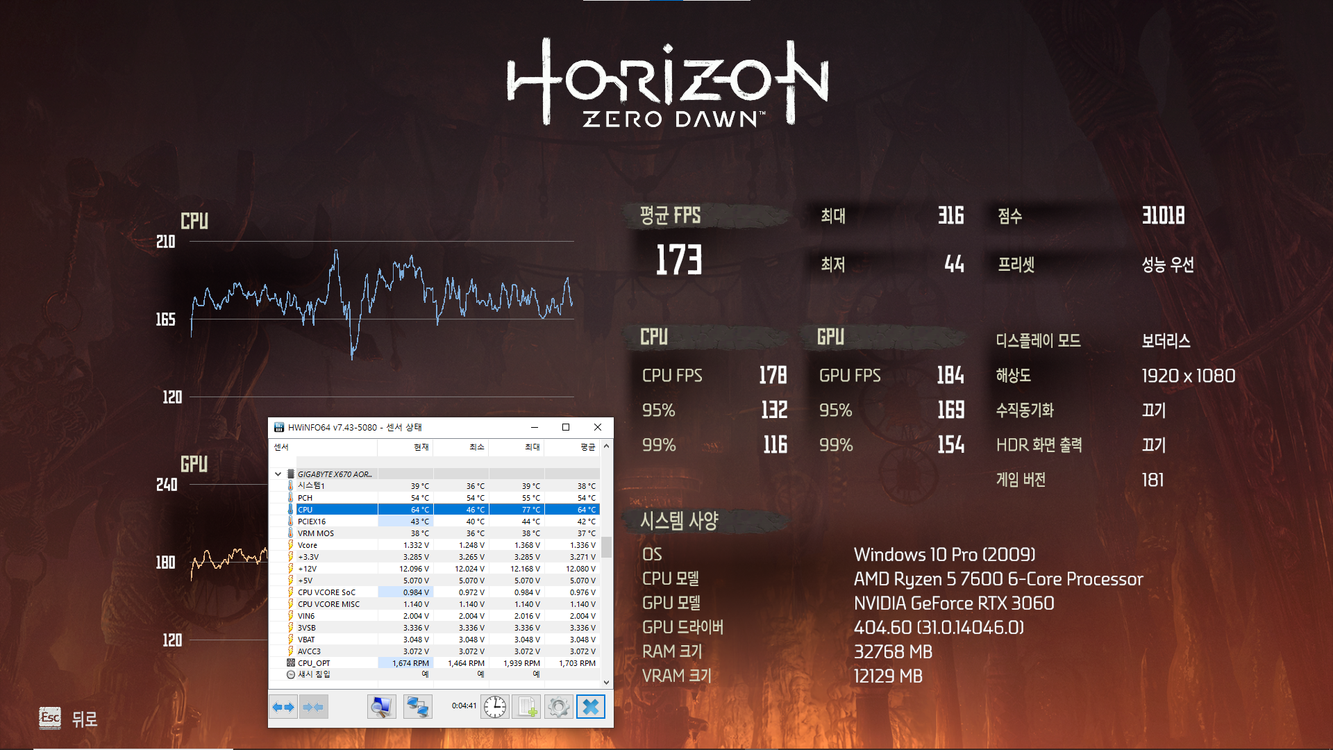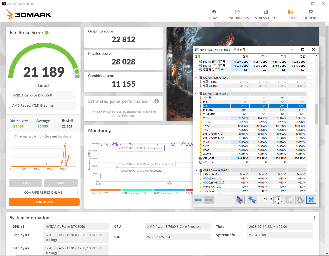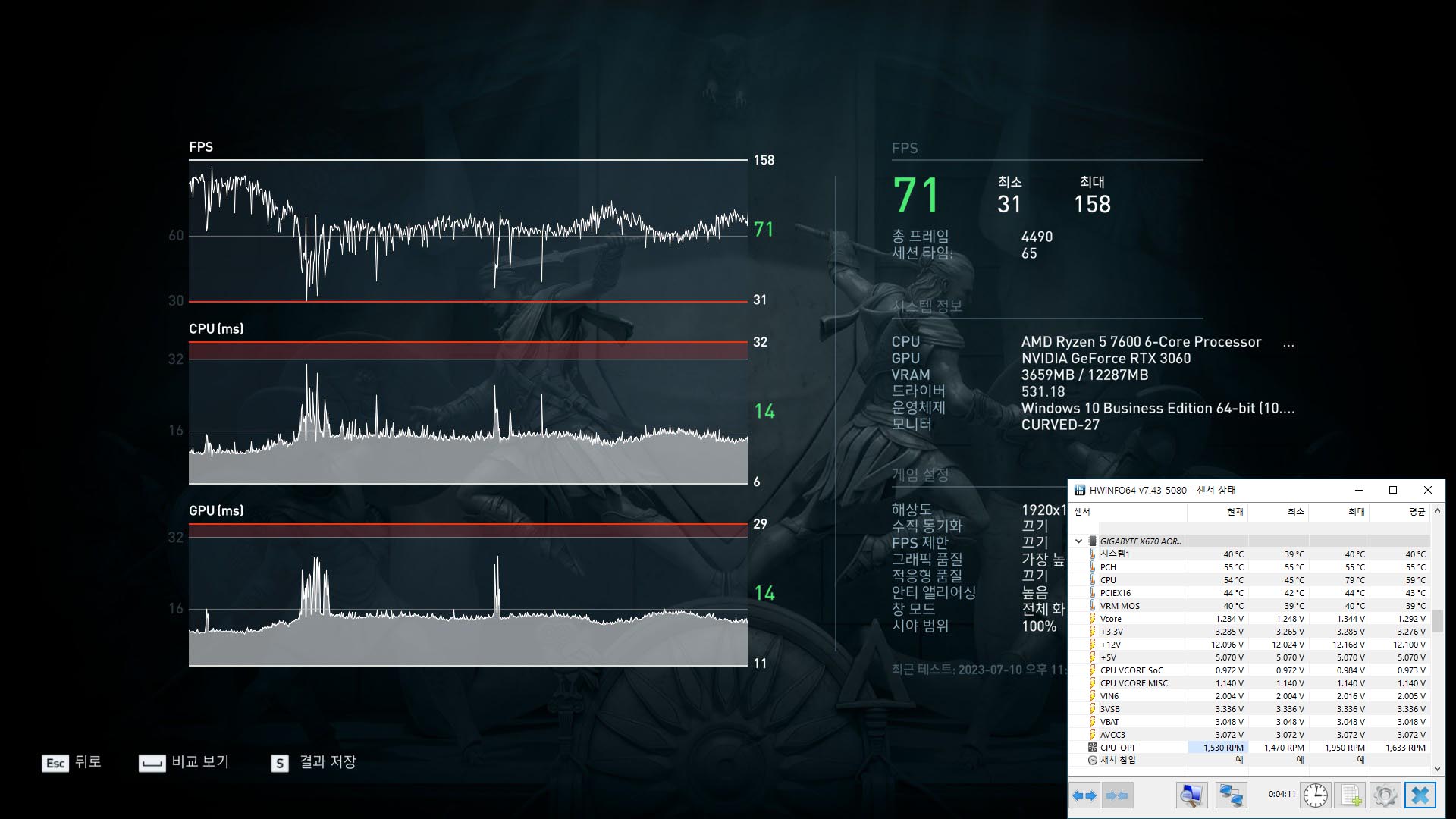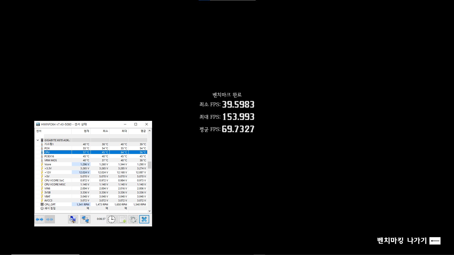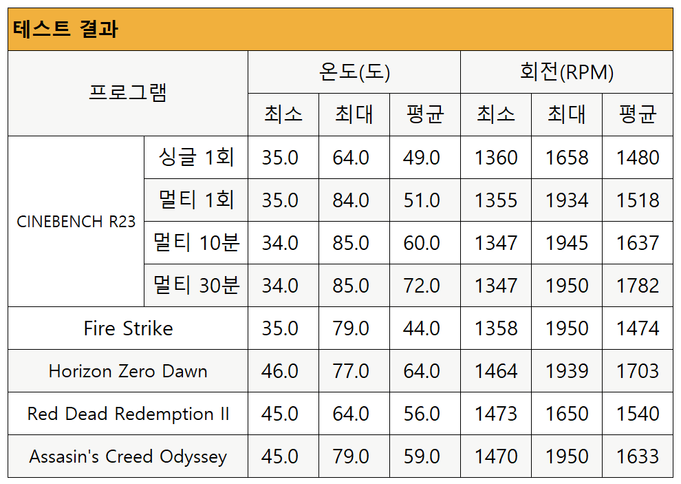CINEBENCH R23 으로, CPU를 일정 시간 동안 최대 부하를 걸었을때, 온도와 쿨링팬의 회전 속도를 테스트를 진행했습니다. 그리고 게임 벤치마크로 많이 사용되는 3DMARK의 Fire Strike와 평소 즐기는 게임 3종을 테스트 진행했습니다.