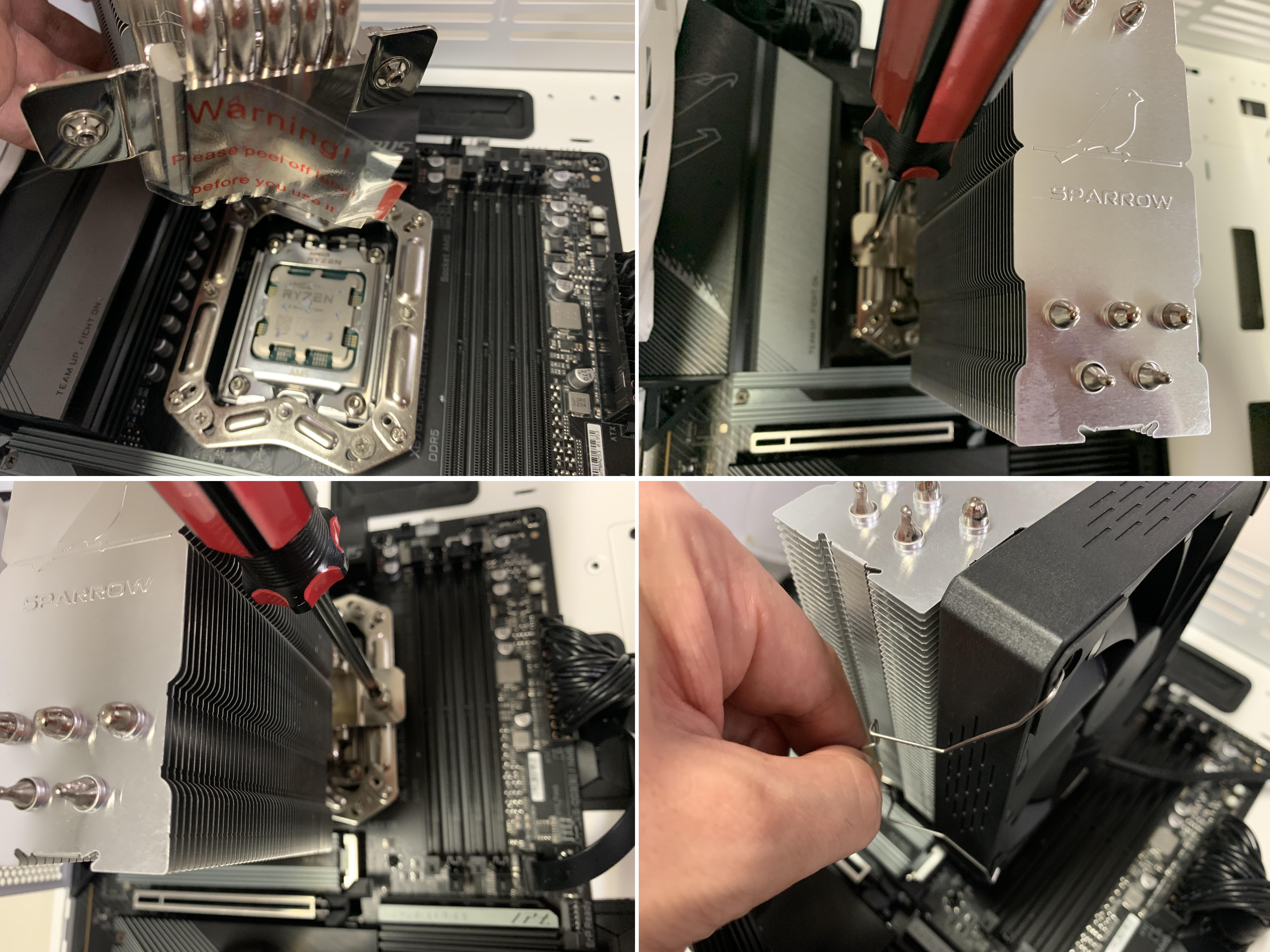 최신 AMD 및 인텔 프로세서의 다양한 소켓을 지원하기에 설치에 필요한 부품들이 많아서 복잡해 보이지만, 지원 소켓 별 스티커가 붙어 있고, 설명서가 자세하기 때문에 쉽게 조립이 가능합니다.