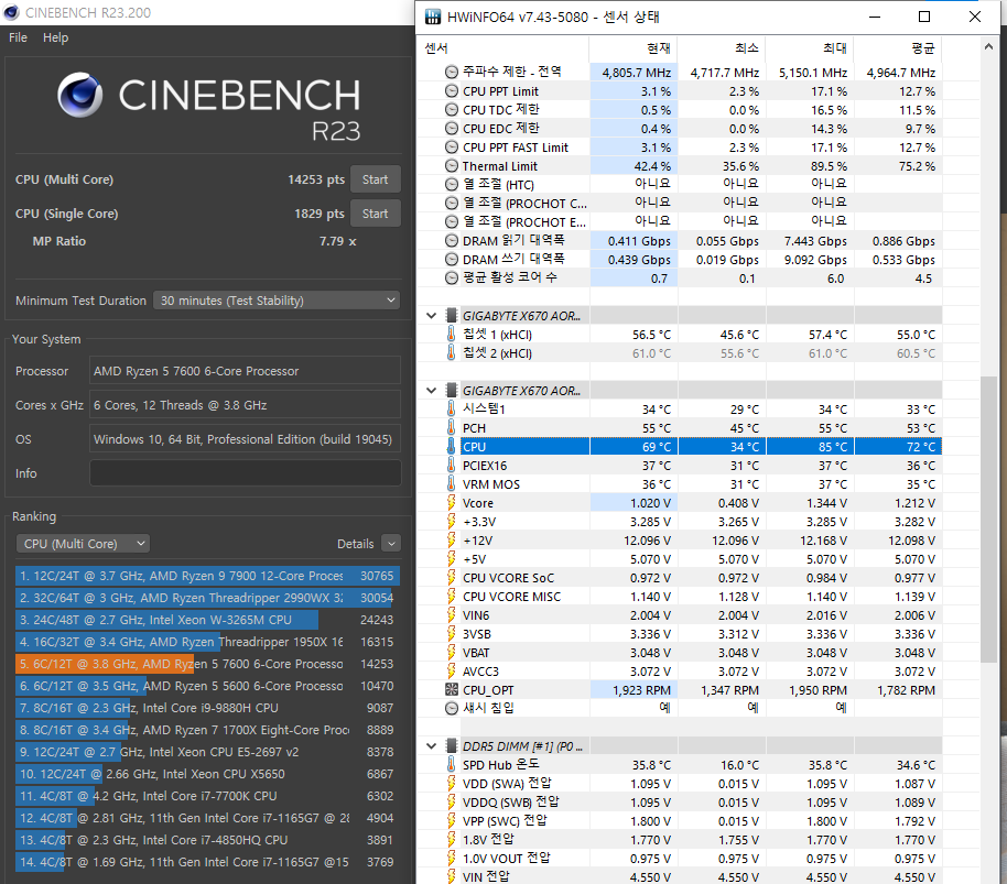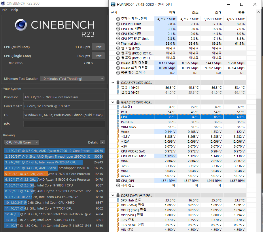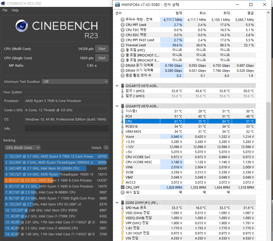 라이젠 7600을 PBO Enabled 상태에서, CINEBENCH R23 멀티 테스트 1회 실행했을때, 최대 온도가 84도 였습니다.
