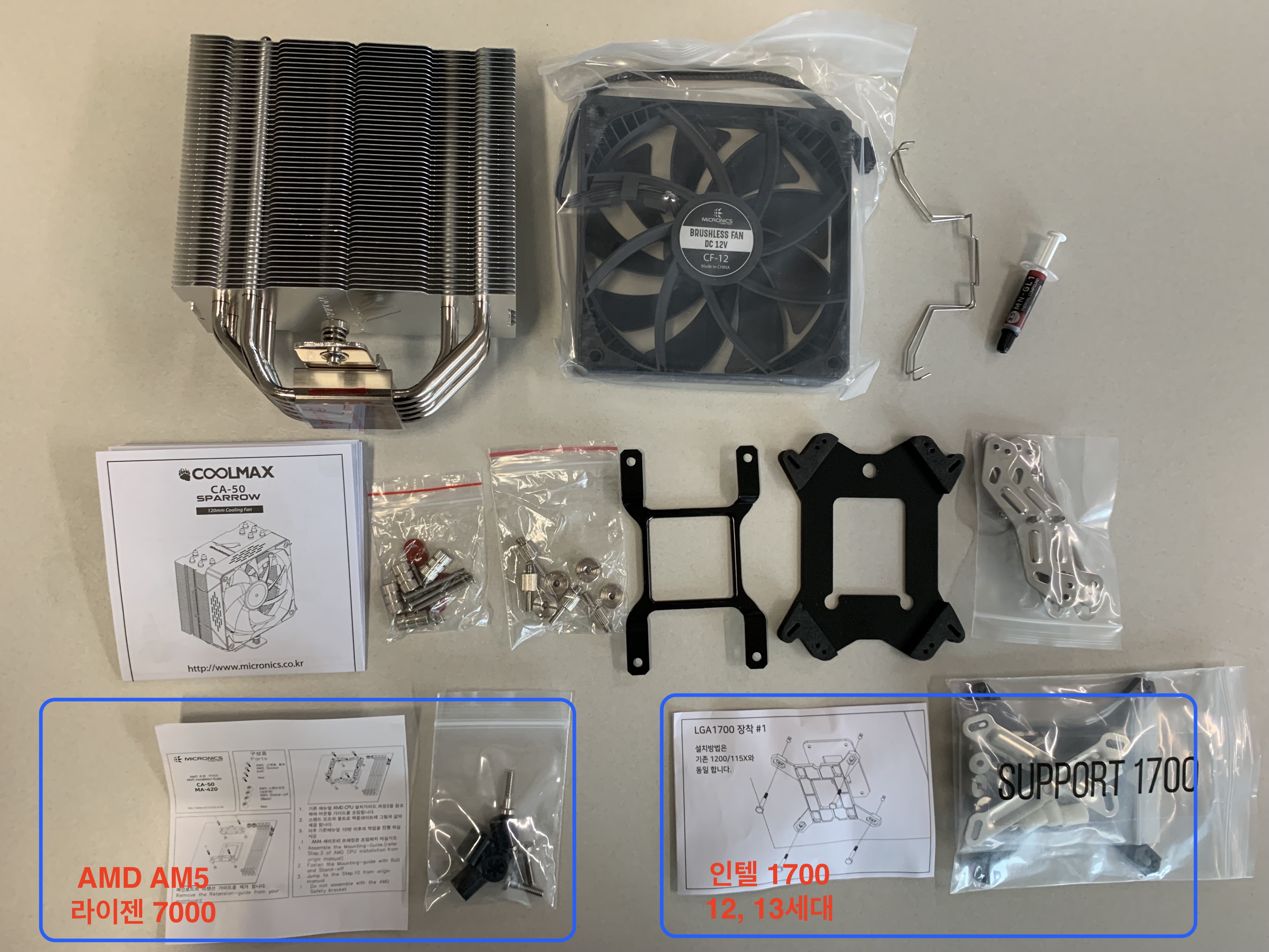 쿨러 본체, 설명서, 써멀 구리스, 그리고 CPU 제조사별 구분된 브라켓으로 구성되어 있습니다.