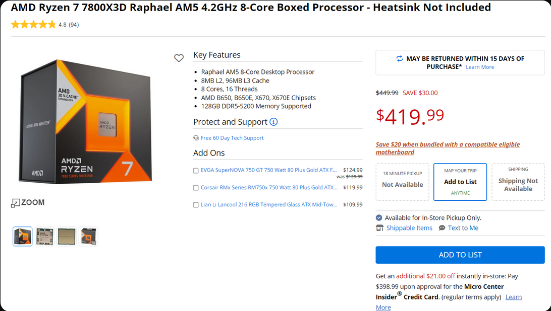 두 달이 지났고 AMD Ryzen 7 7800X3D에 대한 398달러의 미국 거래는 여전히 미국 최고의 온라인 소매업체인 Microcenter에서 계속됩니다 . 이 거래는 미친 게임용 CPU를 엄청난 가치로 얻게 되므로 새로운 Ryzen 빌더에게 특히 좋습니다. 이 칩은 US $419.99에 나와 있지만 호환되는 AM5 마더보드를 구입할 때 US $399로 가격을 낮추는 경우 $20 할인을 받을 수 있습니다. 또한 Micro Center Insider 신용 카드 승인 시 미화 21달러를 추가로 할인받아 가격을 미화 377달러로 낮출 수 있습니다. 이는 MSRP보다 가격이 -16% 하락한 것입니다.