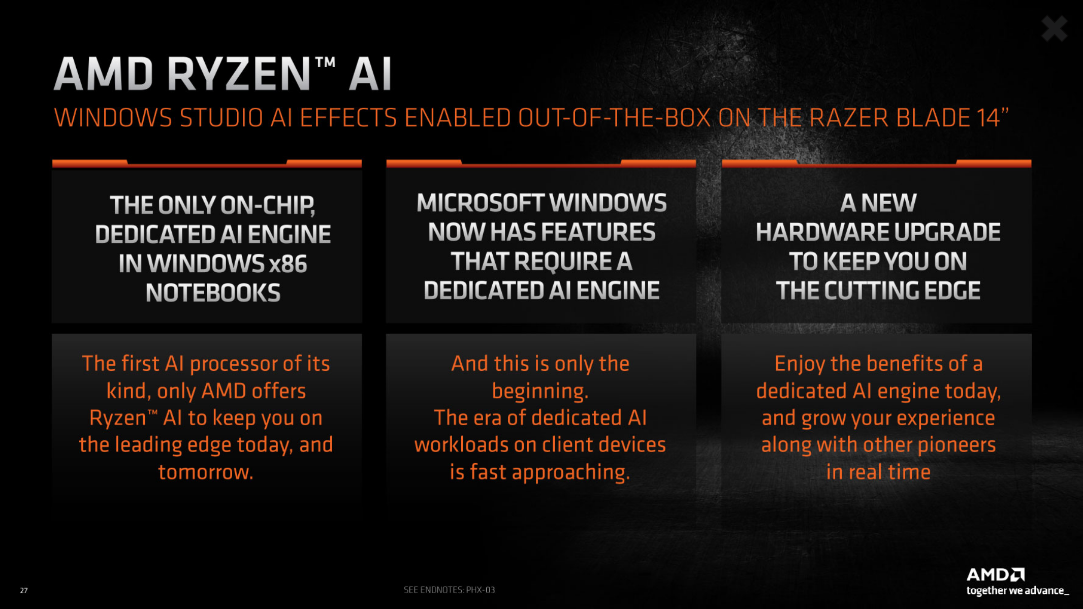 AI는 몇 년 동안 AMD의 주요 초점 영역이었으며 AMD와 Xilinx가 함께 하는 시기는 매우 운이 좋았습니다. 2006년 AMD와 ATI가 함께 했을 때 두 기술을 결합한 첫 번째 제품이 2012년에 출시되었습니다. 그렇게 되기까지 오랜 시간이 걸렸습니다. Ryzen APU에 Xilinx AI 엔진을 통합한 것은 AMD와 Xilinx 인수가 완료된 지 1년이 조금 넘은 시점에서 이루어졌습니다. 이것은 AI에 대한 우리의 계획과 AI가 앞으로 우리 프로세서의 큰 부분이 되는 것에 대한 중요성을 말해줍니다. AI에 대한 MD의 비전은 에지에서 클라우드 및 그 사이의 모든 것에 걸쳐 있으며 AI는 우리가 하는 많은 일을 향상시킬 것입니다. 클라이언트 측에서 그것에 대해 생각할 때, 저는 여러분이 게이머이든, 크리에이터든, 아니면 둘 다이든, 주로 생산성을 위해 PC를 사용하든,