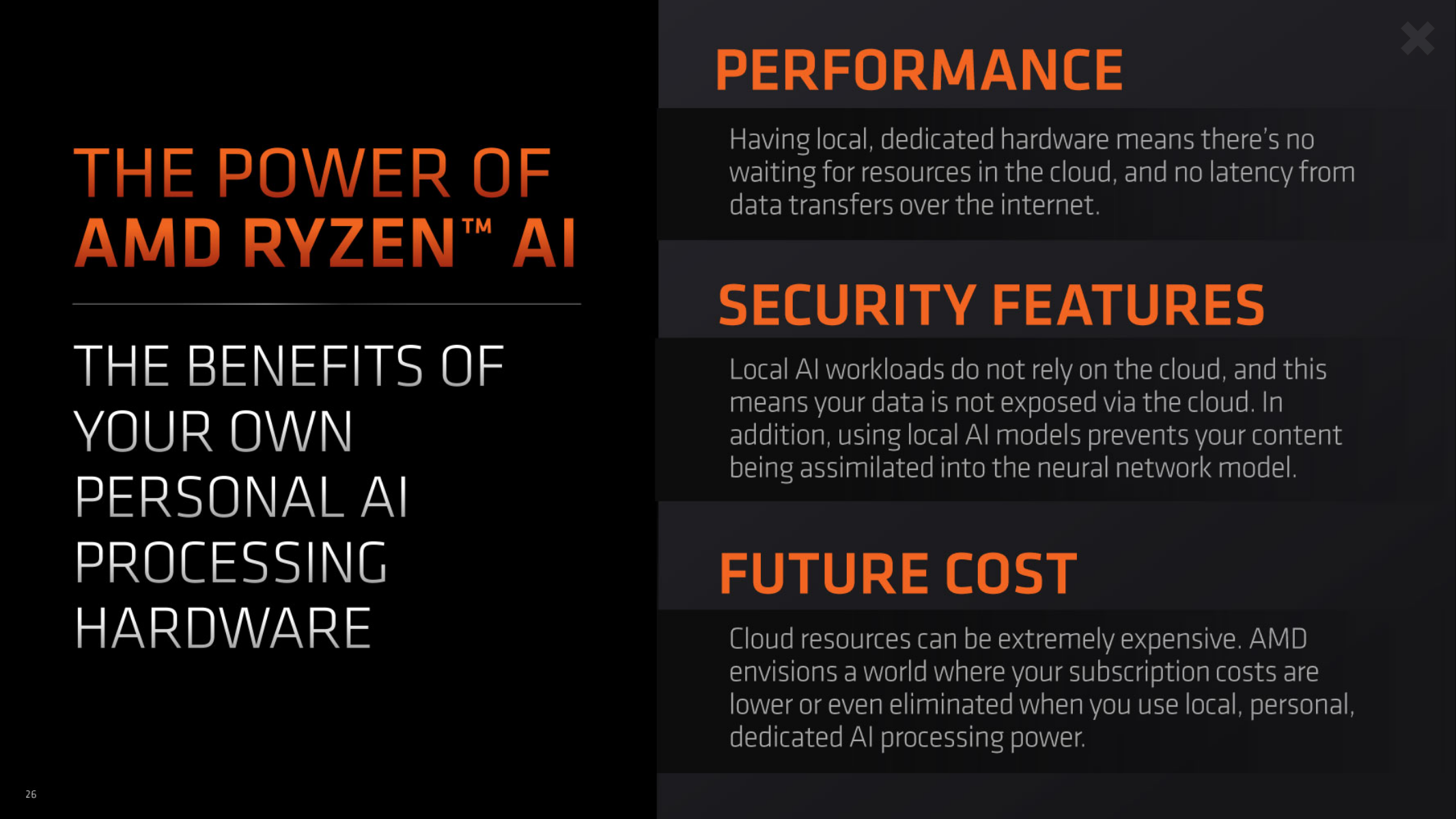 Ryzen AI와 그것이 노트북에 있는 이유는 기능만큼이나 와트당 처리량과 와트당 성능에 관한 것입니다. 진실은 이러한 명령 유형에 대해 올바른 방식으로 양자화될 때 많은 엔진과 모델이 CPU 또는 GPU에서 쉽게 실행될 것이기 때문입니다. 여기서 궁극적인 비전은 오늘날 여러분이 보고 있는 것이 AI의 얼리 어답터이거나 비디오 피드 처리, 시선 교정, 배경 분할 등과 같은 것입니다. 흥미롭지만 그것들은 AI의 주기적인 사용이며 AI가 어디로 가는지에 대한 궁극적인 비전은 AI가 지속적으로 실행되는 것이 아니라 시스템의 백그라운드 작업으로 정기적으로 실행되는 무언가가 되는 것이라고 생각합니다. 배터리 수명을 죽이거나 과도한 열을 발생시키지 않고 이를 수행할 수 있도록 SoC에 고도로 에너지 최적화된 엔진을 갖추는 것은 매우 중요합니다. 현실은 CPU가 그 모든 일을 할 수 있지만 CPU는 그러한 유형의 작업에 최적화되어 있지 않다는 것입니다. 나에게 그것은 비유입니다. VP9 비디오 스트림을 가져 와서 CPU에서 디코딩하면 배터리 수명이 완전히 파괴됩니다. 완전히 최적화된 비디오 재생 엔진에서 그렇게 하면 몇 시간 동안 비디오를 재생하는 배터리 수명을 얻을 수 있습니다. Ryzen AI 엔진이 무엇이며 애플리케이션 및 OS 경험의 일부로 AI의 보다 지속적인 운영을 가능하게 하는 측면에서 무엇을 할 것인지에 대해 생각해 볼 때 상당히 좋은 비유라고 생각합니다. CPU는 해당 유형의 작업에 최적화되어 있지 않습니다. 나에게 그것은 비유입니다. VP9 비디오 스트림을 가져 와서 CPU에서 디코딩하면 배터리 수명이 완전히 파괴됩니다. 완전히 최적화된 비디오 재생 엔진에서 그렇게 하면 몇 시간 동안 비디오를 재생하는 배터리 수명을 얻을 수 있습니다. Ryzen AI 엔진이 무엇이며 애플리케이션 및 OS 경험의 일부로 AI의 보다 지속적인 운영을 가능하게 하는 측면에서 무엇을 할 것인지에 대해 생각해 볼 때 상당히 좋은 비유라고 생각합니다. CPU는 해당 유형의 작업에 최적화되어 있지 않습니다. 나에게 그것은 비유입니다. VP9 비디오 스트림을 가져 와서 CPU에서 디코딩하면 배터리 수명이 완전히 파괴됩니다. 완전히 최적화된 비디오 재생 엔진에서 그렇게 하면 몇 시간 동안 비디오를 재생하는 배터리 수명을 얻을 수 있습니다. Ryzen AI 엔진이 무엇이며 애플리케이션 및 OS 경험의 일부로 AI의 보다 지속적인 운영을 가능하게 하는 측면에서 무엇을 할 것인지에 대해 생각해 볼 때 상당히 좋은 비유라고 생각합니다. 비디오를 재생하는 몇 시간의 배터리 수명을 얻을 수 있습니다. Ryzen AI 엔진이 무엇이며 애플리케이션 및 OS 경험의 일부로 AI의 보다 지속적인 운영을 가능하게 하는 측면에서 무엇을 할 것인지에 대해 생각해 볼 때 상당히 좋은 비유라고 생각합니다. 비디오를 재생하는 몇 시간의 배터리 수명을 얻을 수 있습니다. Ryzen AI 엔진이 무엇이며 애플리케이션 및 OS 경험의 일부로 AI의 보다 지속적인 운영을 가능하게 하는 측면에서 무엇을 할 것인지에 대해 생각해 볼 때 상당히 좋은 비유라고 생각합니다.