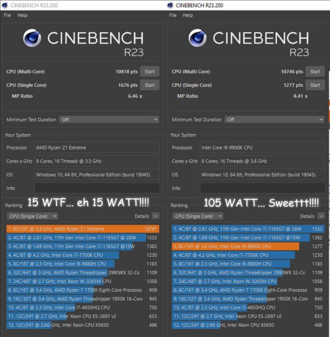 AMD는 Ryzen Z1 Extreme 프로세서로 ROG Ally 에 힘을 실어 콘솔 시장을 계속 지배하고 있습니다 . Zen 4 CPU 코어와 RDNA 3 그래픽 아키텍처를 기반으로 하는 이 칩은 지금까지 출시된 것 중 가장 성능이 뛰어난 핸드헬드 콘솔을 구동합니다. Ryzen Z1 Extreme의 Cinebench R23 벤치마크는 15W 칩 이 몇 년 전의 Intel 데스크톱 플래그십을 능가한다는 것을 보여줍니다.
