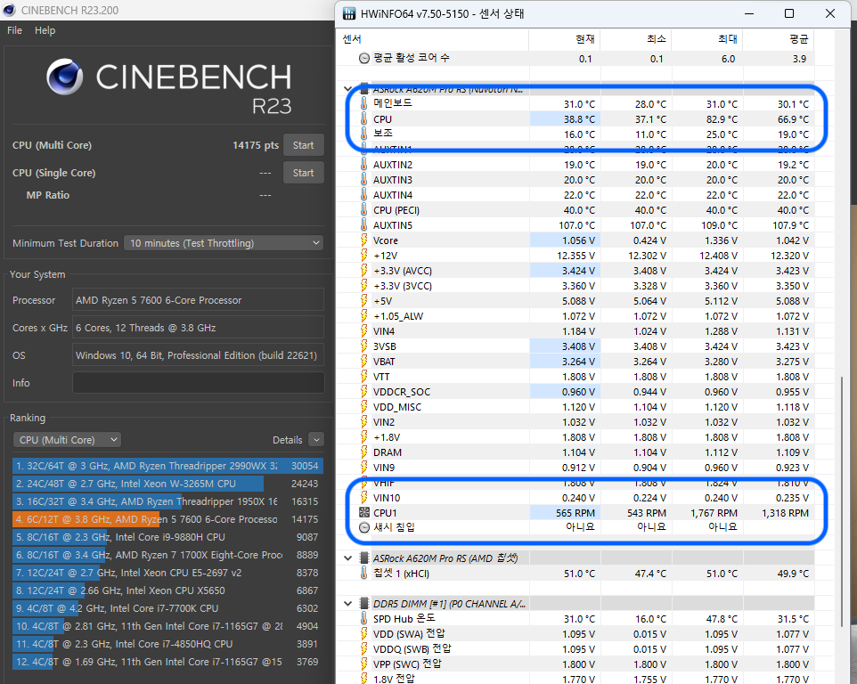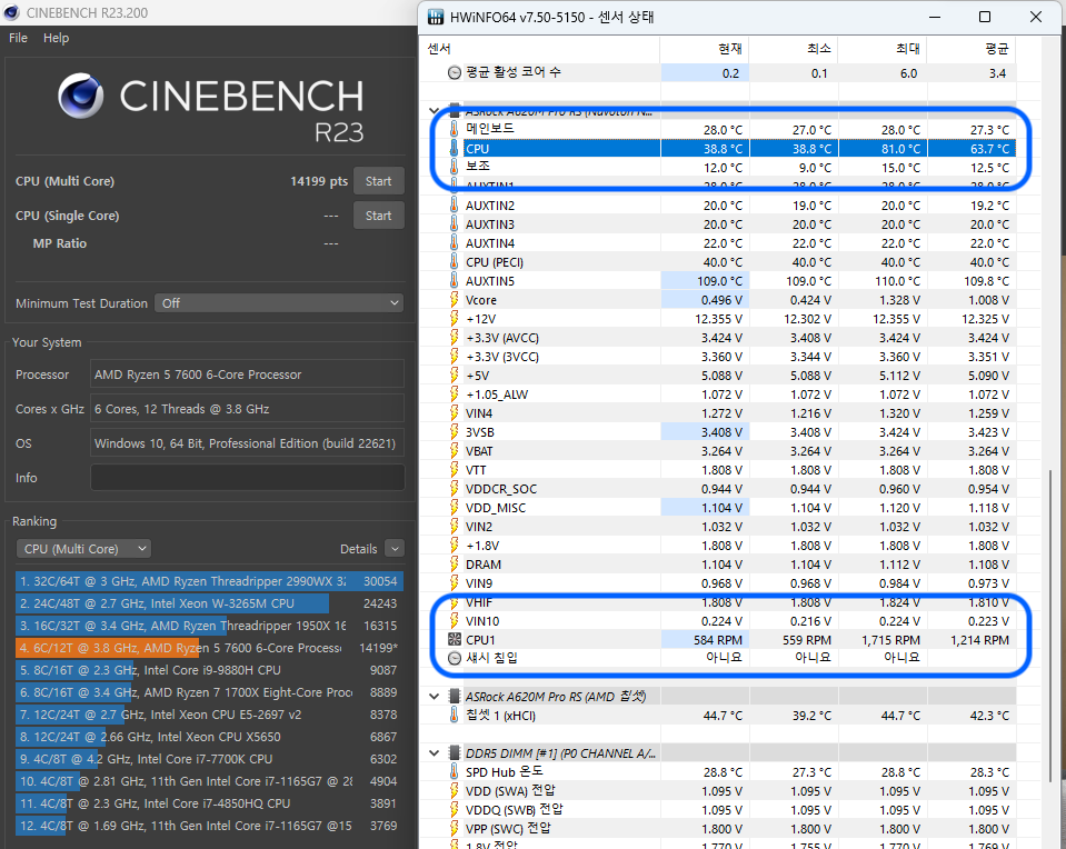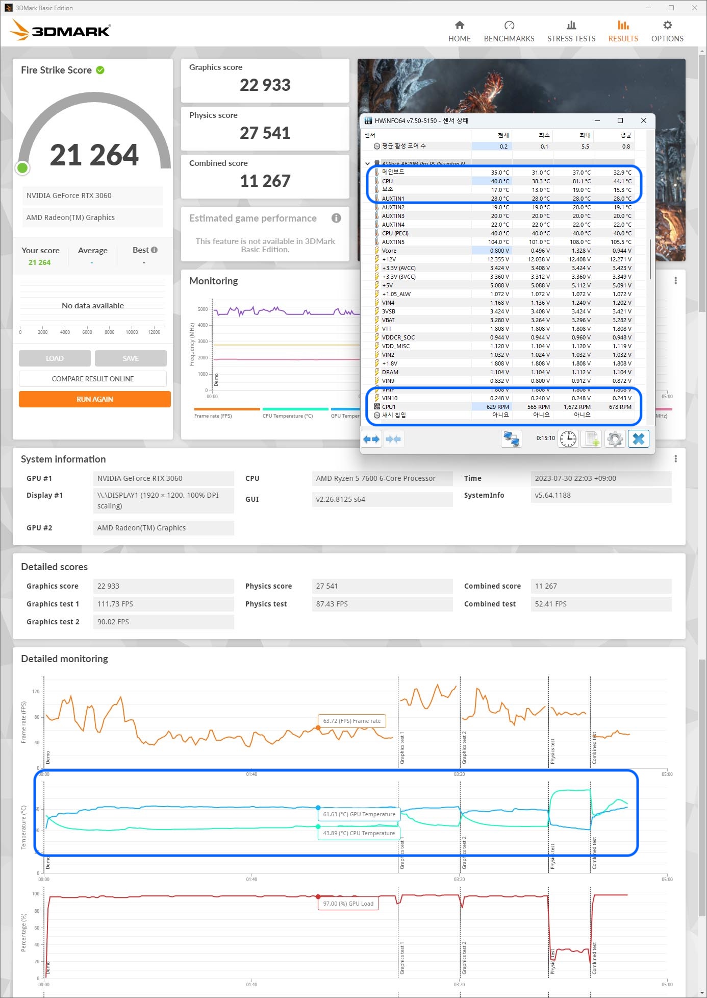 CINEBENCH R23 으로, CPU를 일정 시간 동안 최대 부하를 걸었을때, 온도와 쿨링팬의 회전 속도를 테스트를 진행했습니다. 그리고 게임 벤치마크로 많이 사용되는 3DMARK의 Fire Strike로 테스트를 진행했습니다.