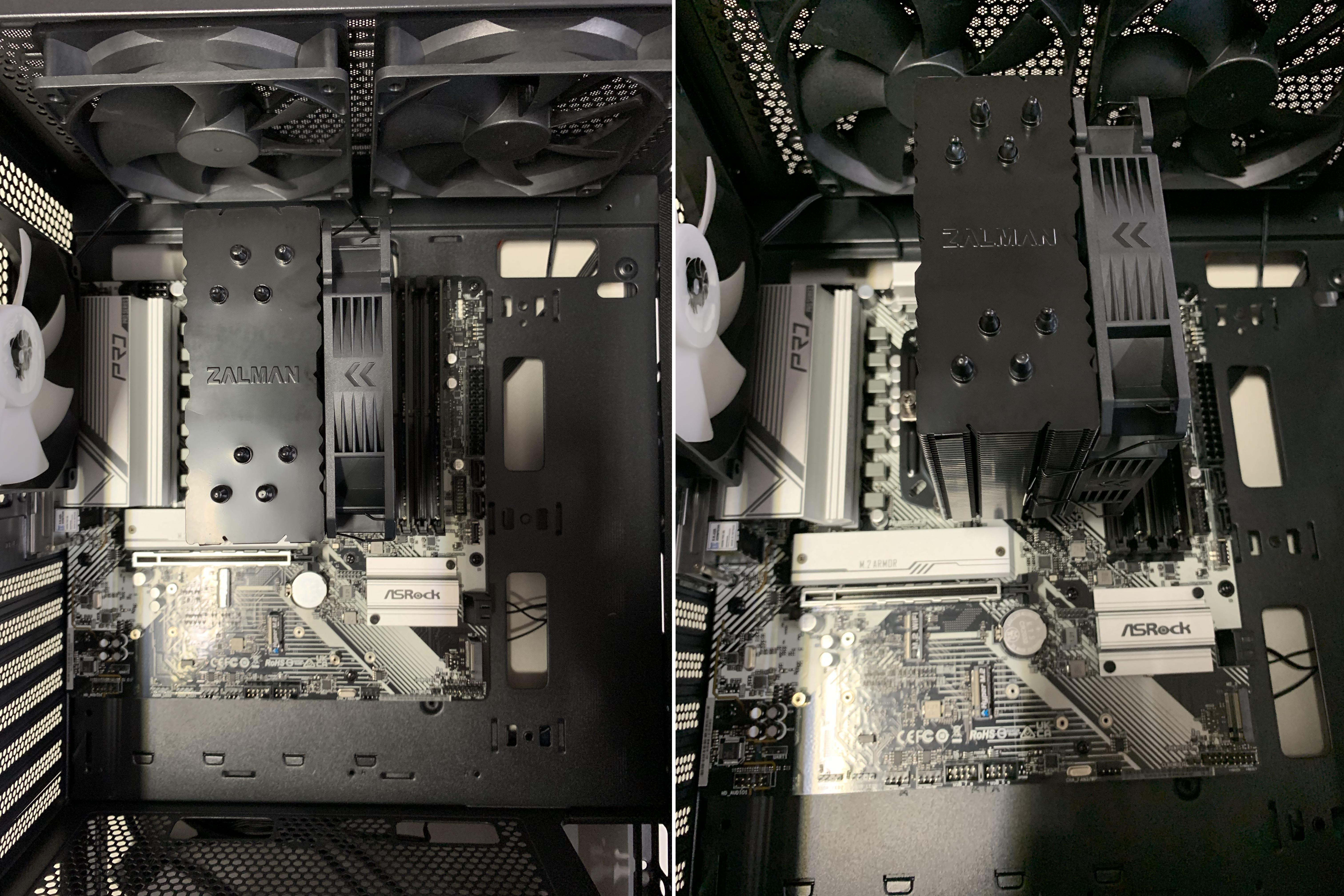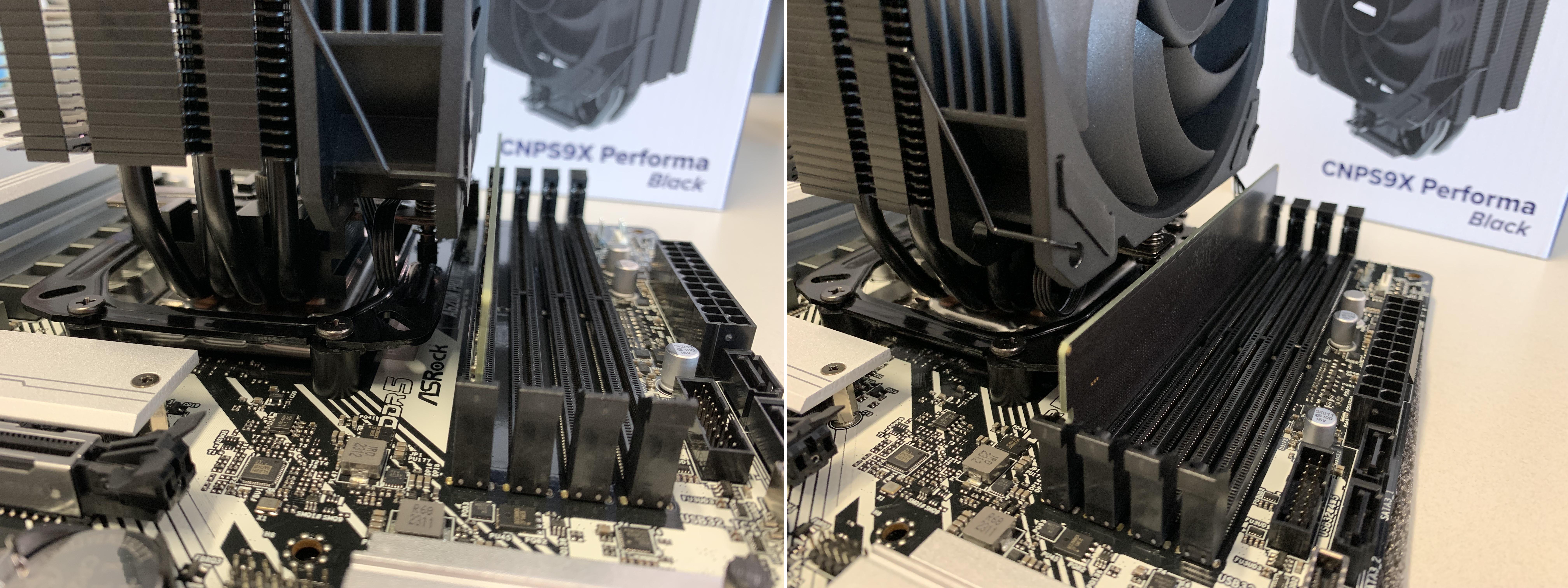 방열판이 없는 DDR5램이지만, CPU쿨러와 램의 거리가 충분히 여유가 있기 때문에, 램 방열판이 있고 풀뱅크로 구성하더라도, 쿨러와 램의 간섭은 일어 나지 않을 정도로 호환성이 좋음을 알 수 있습니다.