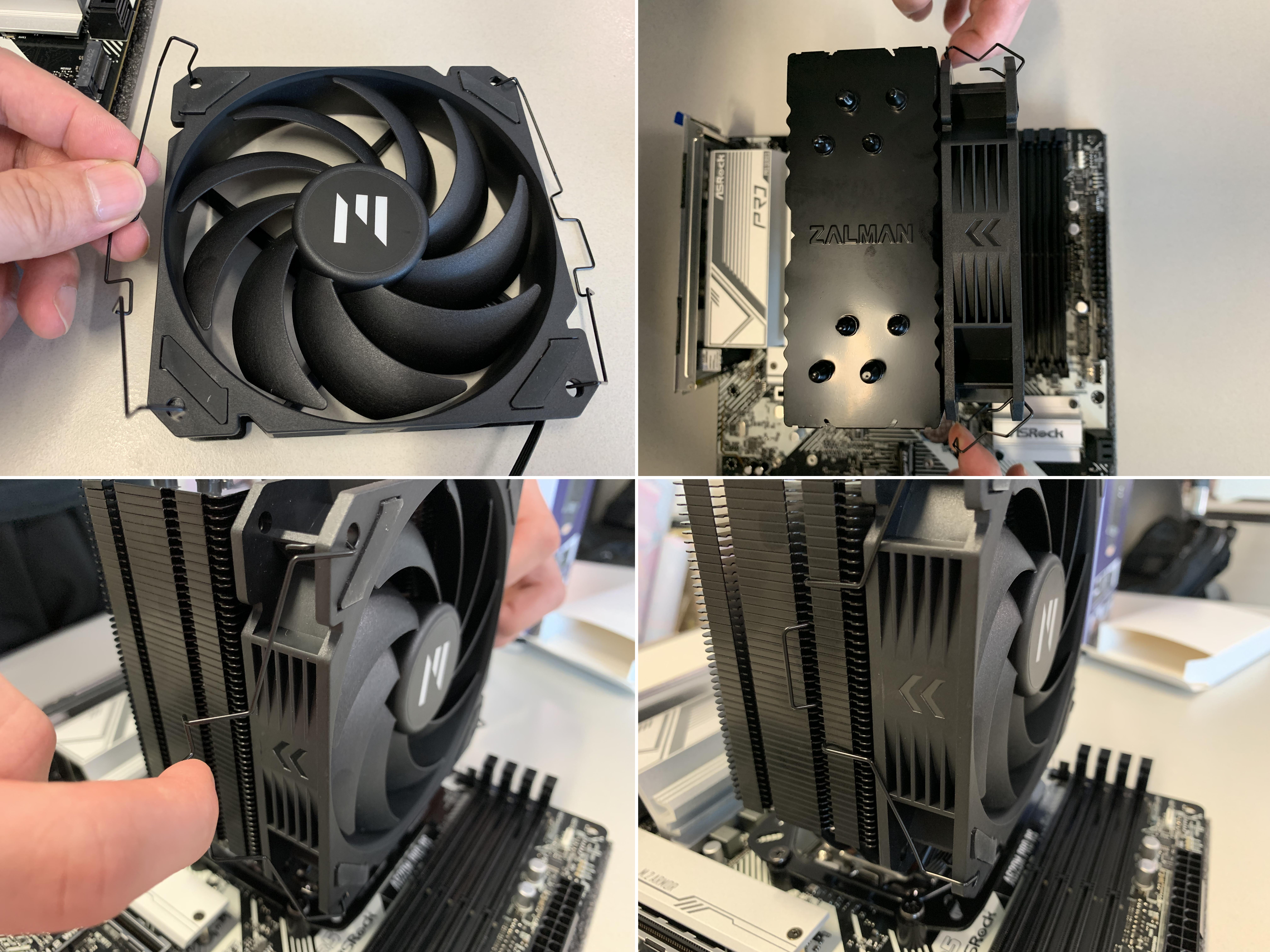 팬 클립을 쿨링팬에 먼저 연결한 다음, 사진과 같이 손가락으로 벌려 당기듯 힘주어 고정시킵니다.