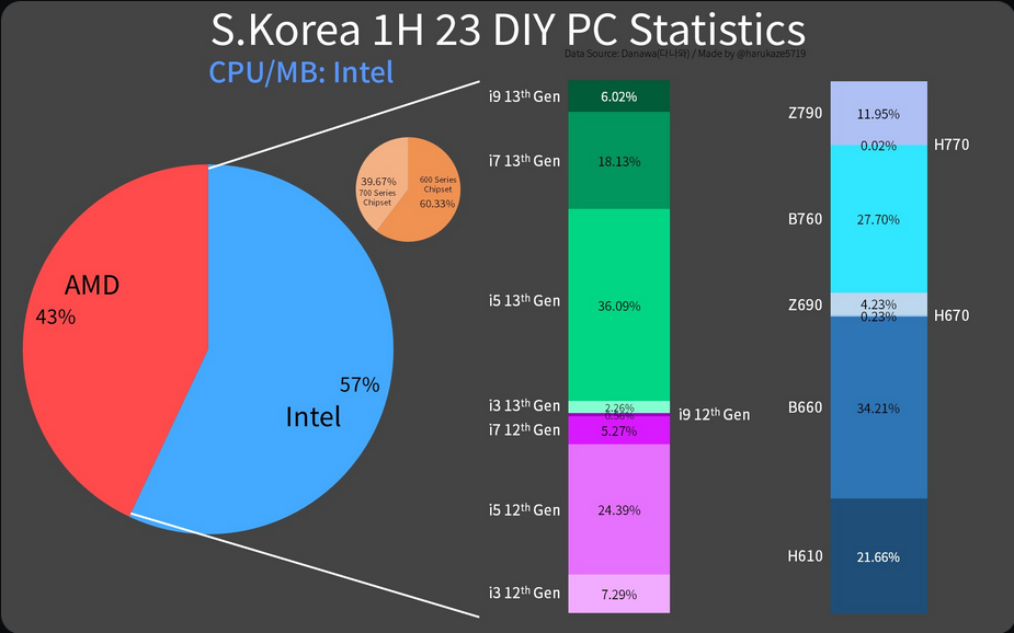 한국의 DIY 소매업체인 Danawa, 2023년 상반기 PC 시장 통계 공유: NVIDIA가 CPU 부문에서 GPU, AMD 및 Intel의 선두를 거의 동등하게 분할