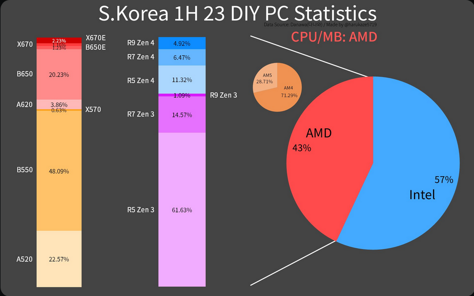AMD 진영으로 이동하면 한국 DIY PC 빌더의 28.71%가 AM5로 이동했으며 대다수(71.29%)는 여전히 AM4 플랫폼을 사용하고 있습니다. Ryzen 5000 제품군의 AMD Ryzen 5 및 Ryzen 7 칩은 AM4에서 가장 인기가 있으며 Ryzen 7000 "Zen 4" 시리즈도 마찬가지입니다. 대부분의 AM4 빌더는 A520에 이어 B550 마더보드를 실행하고 있으며 AM5 사용자의 경우 B650이 여전히 가장 인기 있는 선택입니다. A620 제품은 최신 제품이며 A520 보드보다 기능이 부족하고 가격이 높기 때문에 3.86%의 점유율을 차지합니다.