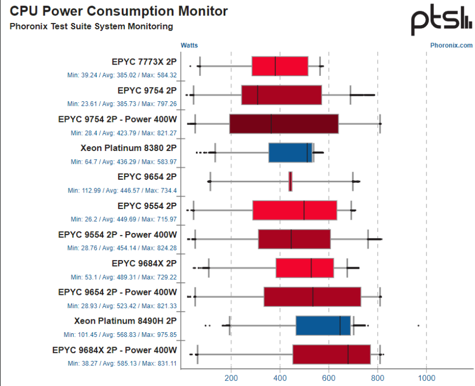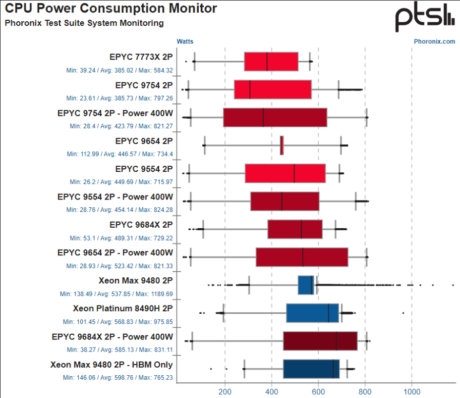 수행된 이 모든 벤치마크에서 EPYC 9754 2P는 평균 385와트의 전력을 소모했습니다... 이에 비해 EPYC 9654 2P는 평균 447와트, EPYC 9684X 2P는 평균 464와트였습니다. 그리고 평균 568W로 훨씬 더 많은 전력을 소비하는 Xeon Platinum 8490H 60코어 프로세서를 언급할 필요가 있습니다. EPYC 9754 전력 소비 결과는 솔직히 Zen 4C가 여전히 좋은 성능을 발휘하면서 전력 효율 개선을 제공할 것이라고는 예상하지 못했다는 점에서 제 예상을 뛰어넘었습니다.