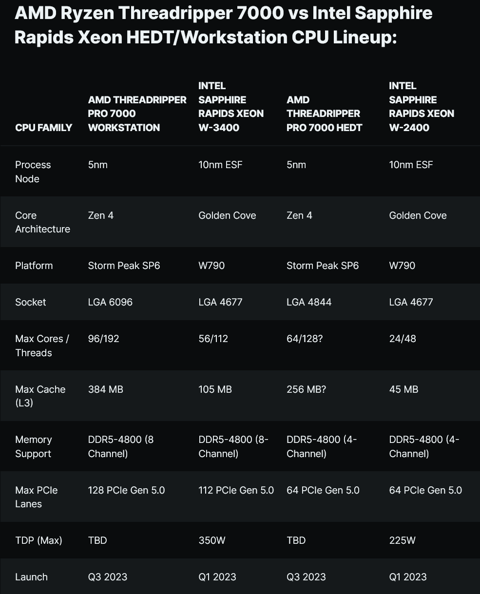 이것이 8채널 DDR5 메모리 솔루션과 함께 제공되는 Pro 칩이라는 점을 고려할 때 WS 플랫폼을 볼 수 있을 가능성이 높습니다. 표준 HEDT 칩에는 "Pro" 브랜딩이 없을 가능성이 높습니다. 또한 이것이 7985WX SKU라는 점을 고려하면 7995WX SKU는 Genoa 칩과 동일한 전체 96개 코어를 특징으로 할 수 있습니다. 지난달 에도 여러 SKU가 유출 되었으며 2023년 3분기에 출시 될 예정이라고 합니다 . 아직 확정된 것이 없기 때문에 변경될 수 있습니다.