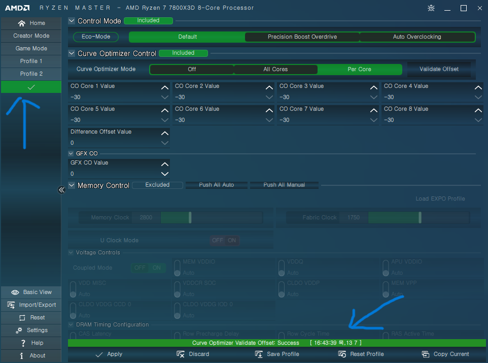 제가 테스트한 7800X3D는 수율이 좋은건지 라이젠 마스터에서 줄수 있는 최대값을 입력하고도 성공했습니다.