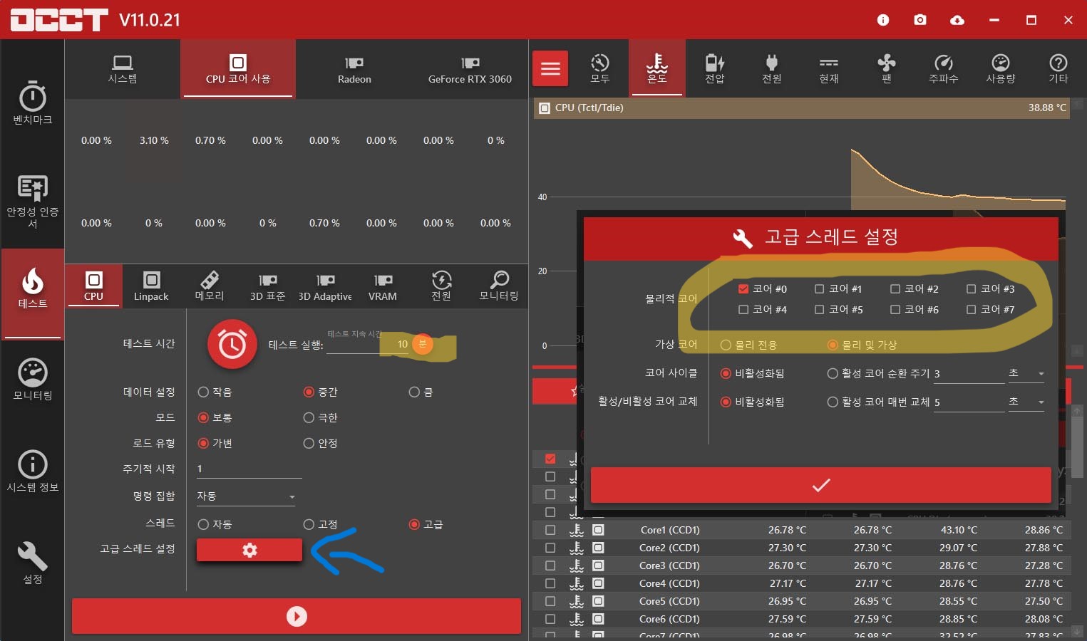 OCCT 프로그램에서 시간은 10분으로 설정하고, 톱니바퀴를 눌러 테스트할 코어와 값을 설정을 한 다음 테스트를 진행했습니다.