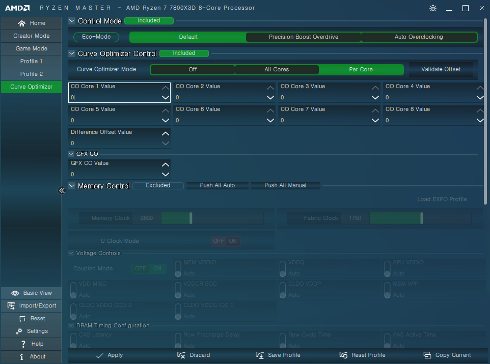 윈도우에서 라이젠 마스터 프로그램에서 CO 탭을 선택하면 모든 코어 값이 0으로 설정되어 있습니다.