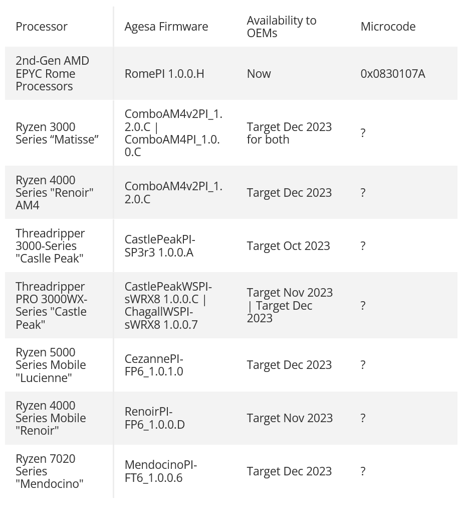 Desktop CPUNew Agesa Firmware VersionPatch DueRyzen 3 3100 ComboAM4v2PI_1.2.0.C | ComboAM4PI_1.0.0.C Dec 2023 Ryzen 3 3300X ComboAM4v2PI_1.2.0.C | ComboAM4PI_1.0.0.C Dec 2023 Ryzen 3 4100 ComboAM4v2PI_1.2.0.C Nov 2023 Ryzen 3 4300G ComboAM4v2PI_1.2.0.C Dec 2023 Ryzen 3 4300GE ComboAM4v2PI_1.2.0.C Dec 2023 Ryzen 4700S ComboAM4v2PI_1.2.0.C Nov 2023 Ryzen 5 3500 ComboAM4v2PI_1.2.0.C | ComboAM4PI_1.0.0.C Dec 2023 Ryzen 5 3500X ComboAM4v2PI_1.2.0.C | ComboAM4PI_1.0.0.C Dec 2023 Ryzen 5 3600 ComboAM4v2PI_1.2.0.C | ComboAM4PI_1.0.0.C Dec 2023 Ryzen 5 3600X ComboAM4v2PI_1.2.0.C | ComboAM4PI_1.0.0.C Dec 2023 Ryzen 5 3600XT ComboAM4v2PI_1.2.0.C | ComboAM4PI_1.0.0.C Dec 2023 Ryzen 5 4500 ComboAM4v2PI_1.2.0.C Nov 2023 Ryzen 5 4600G ComboAM4v2PI_1.2.0.C Dec 2023 Ryzen 5 4600GE ComboAM4v2PI_1.2.0.C Dec 2023 Ryzen 7 3700X ComboAM4v2PI_1.2.0.C | ComboAM4PI_1.0.0.C Dec 2023 Ryzen 7 3800X ComboAM4v2PI_1.2.0.C | ComboAM4PI_1.0.0.C Dec 2023 Ryzen 7 3800XT ComboAM4v2PI_1.2.0.C | ComboAM4PI_1.0.0.C Dec 2023 Ryzen 7 4700G ComboAM4v2PI_1.2.0.C Dec 2023 Ryzen 7 4700GE ComboAM4v2PI_1.2.0.C Dec 2023 Ryzen 9 3900 ComboAM4v2PI_1.2.0.C | ComboAM4PI_1.0.0.C Dec 2023 Ryzen 9 3900X ComboAM4v2PI_1.2.0.C | ComboAM4PI_1.0.0.C Dec 2023 Ryzen 9 3900XT ComboAM4v2PI_1.2.0.C | ComboAM4PI_1.0.0.C Dec 2023 Ryzen 9 3950X ComboAM4v2PI_1.2.0.C | ComboAM4PI_1.0.0.C Dec 2023 Ryzen Threadripper 3960X CastlePeakWSPI-sWRX8 1.0.0.C | ChagallWSPI-sWRX8 1.0.0.9 Nov 2023 / Dec 2023 Ryzen Threadripper 3970X CastlePeakWSPI-sWRX8 1.0.0.C | ChagallWSPI-sWRX8 1.0.0.8 Nov 2023 / Dec 2023 Ryzen Threadripper 3990X CastlePeakWSPI-sWRX8 1.0.0.C | ChagallWSPI-sWRX8 1.0.0.7 Nov 2023 / Dec 2023 Ryzen Threadripper Pro 3945WX CastlePeakWSPI-sWRX8 1.0.0.C | ChagallWSPI-sWRX8 1.0.0.13 Nov 2023 / Dec 2023 Ryzen Threadripper Pro 3955WX CastlePeakWSPI-sWRX8 1.0.0.C | ChagallWSPI-sWRX8 1.0.0.12 Nov 2023 / Dec 2023 Ryzen Threadripper Pro 3975WX CastlePeakWSPI-sWRX8 1.0.0.C | ChagallWSPI-sWRX8 1.0.0.10 Nov 2023 / Dec 2023 Ryzen Threadripper Pro 3995WX CastlePeakWSPI-sWRX8 1.0.0.C | ChagallWSPI-sWRX8 1.0.0.11 Nov 2023 / Dec 2023 Mobile CPUNew Agesa Firmware VersionPatch DueRyzen 3 4300U RenoirPI-FP6_1.0.0.D Nov 2023 Ryzen 3 5300U CezannePI-FP6_1.0.1.0 Dec 2023 Ryzen 3 7320U MendocinoPI-FT6_1.0.0.6 Dec 2023 Ryzen 5 4500U RenoirPI-FP6_1.0.0.D Nov 2023 Ryzen 5 4600H RenoirPI-FP6_1.0.0.D Nov 2023 Ryzen 5 4600HS RenoirPI-FP6_1.0.0.D Nov 2023 Ryzen 5 4600U RenoirPI-FP6_1.0.0.D Nov 2023 Ryzen 5 4680U RenoirPI-FP6_1.0.0.D Nov 2023 Ryzen 5 5500U CezannePI-FP6_1.0.1.0 Dec 2023 Ryzen 5 7520U MendocinoPI-FT6_1.0.0.6 Dec 2023 Ryzen 7 4700U RenoirPI-FP6_1.0.0.D Nov 2023 Ryzen 7 4800U RenoirPI-FP6_1.0.0.D Nov 2023 Ryzen 7 4980U RenoirPI-FP6_1.0.0.D Nov 2023 Ryzen 7 5700U CezannePI-FP6_1.0.1.0 Dec 2023 Ryzen 9 4900H RenoirPI-FP6_1.0.0.D Nov 2023 Ryzen 9 4800H RenoirPI-FP6_1.0.0.D Nov 2023 Ryzen 9 4800HS RenoirPI-FP6_1.0.0.D Nov 2023 Ryzen 9 4900HS RenoirPI-FP6_1.0.0.D Nov 2023 Server CPUNew Agesa Firmware VersionPatch AvailableEPYC 7232P RomePI 1.0.0.H Now EPYC 7252 RomePI 1.0.0.H Now EPYC 7262 RomePI 1.0.0.H Now EPYC 7272 RomePI 1.0.0.H Now EPYC 7282 RomePI 1.0.0.H Now EPYC 7302 RomePI 1.0.0.H Now EPYC 7302P RomePI 1.0.0.H Now EPYC 7352 RomePI 1.0.0.H Now EPYC 7402 RomePI 1.0.0.H Now EPYC 7402P RomePI 1.0.0.H Now EPYC 7452 RomePI 1.0.0.H Now EPYC 7502 RomePI 1.0.0.H Now EPYC 7502P RomePI 1.0.0.H Now EPYC 7532 RomePI 1.0.0.H Now EPYC 7542 RomePI 1.0.0.H Now EPYC 7552 RomePI 1.0.0.H Now EPYC 7642 RomePI 1.0.0.H Now EPYC 7662 RomePI 1.0.0.H Now EPYC 7702 RomePI 1.0.0.H Now EPYC 7702P RomePI 1.0.0.H Now EPYC 7742 RomePI 1.0.0.H Now EPYC 7F32 RomePI 1.0.0.H Now EPYC 7F52 RomePI 1.0.0.H Now EPYC 7F72 RomePI 1.0.0.H Now EPYC 7H12 RomePI 1.0.0.H Now #amd #zen2 #epyc