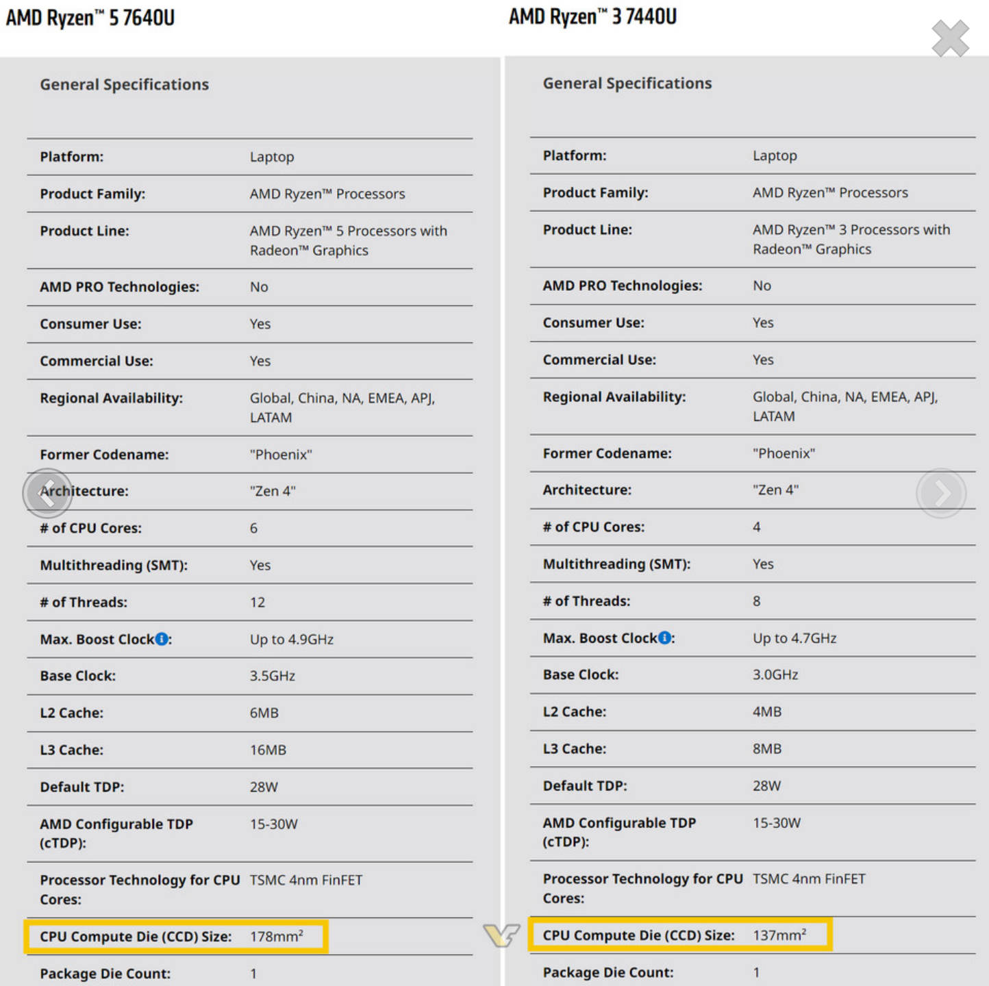 AMD는 이전에 Ryzen 3 7440U의 다이 크기가 더 작을 것이라고 확인했습니다.Ryzen 5 7640U의 178mm²와 비교하여 137mm²입니다. AMD는 Ryzen 5 7540U도 Phoenix2 APU를 기반으로 할 것이라고 직접 확인하지는 않았지만, 공식 사양은 동일한 4개의 GPU 코어와 Ryzen AI 코어가 없는 것으로 나타나 동일한 Phoenix2 APU를 기반으로 할 것이 꽤 분명합니다. 아직 알려지지 않은 것이 많기 때문에 AMD가 Phoenix2 APU에 대한 보다 공식적인 세부 정보를 제공할 수 있기를 바랍니다.
