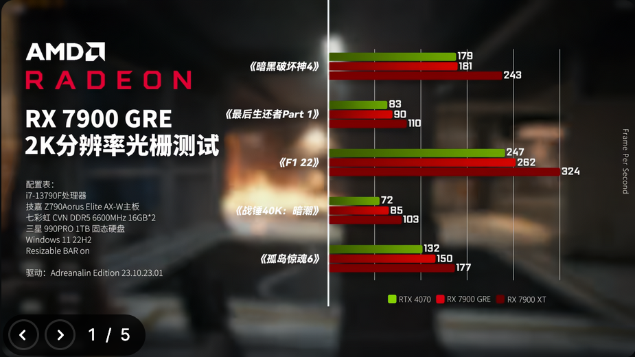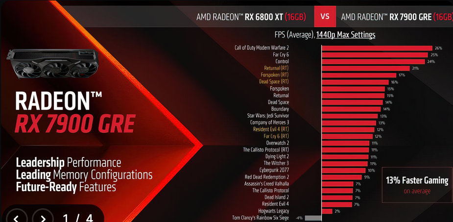 독립적인 검토 외에도 AMD는 다양한 타이틀에서 1440P Max 설정으로 테스트한 카드와 함께 Radeon RX 7900 GRE의 자체 공식 성능 수치를 제공합니다. 다음은 카드에서 기대할 수 있는 평균 FPS입니다.