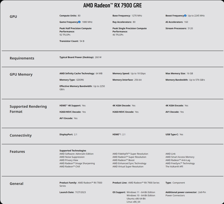 AMD는 독점 RDNA 3 그래픽 카드인 Radeon RX 7900 GRE 16GB GPU를 미화 649달러에 공식 출시 했습니다.