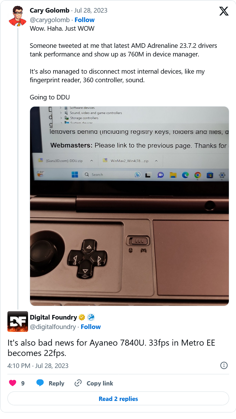 인터넷은 종종 나쁜 그래픽 드라이버에 대해 AMD를 비난했지만 Twitter의 @carygolomb 에 따르면 그 평판이 회사를 괴롭히기 위해 돌아올 수 있습니다. Twitter 사용자는 Adrenalin 드라이버 23.7.2로 업데이트하면 핸드헬드 게임 장치의 GPU 성능이 떨어지고 Radeon 780M 통합 GPU의 브랜드를 훨씬 느린 760M으로 변경했다고 보고했습니다 . 또한 사용자는 지문 판독기, 사운드 카드 및 Xbox 360 게임 컨트롤러를 포함하여 새 드라이버가 활성화된 상태에서 더 이상 작동하지 않는 일부 내부 및 외부 장치의 문제를 보고했습니다.