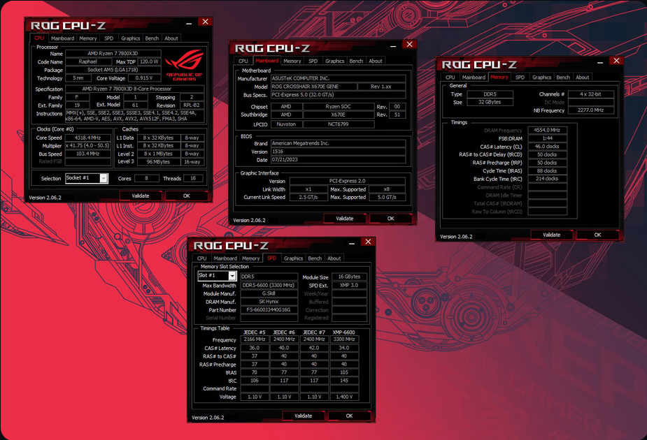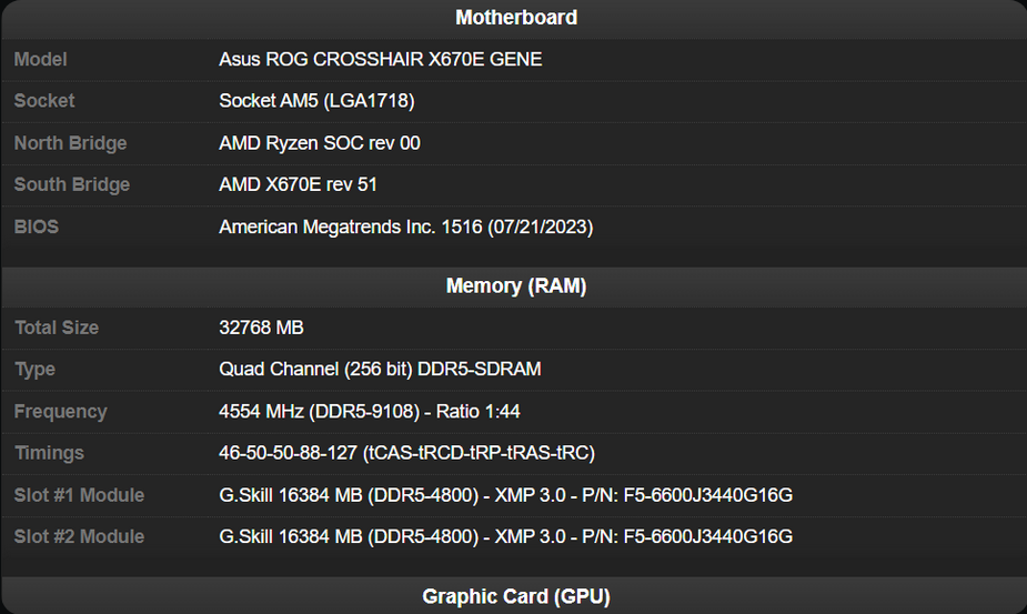 ASUS ROG Crosshair X670E GENE 마더보드와 AMD Ryzen 7 7800X3D CPU를 사용하여 오버클럭커는 최대 DDR5-9108(4554 유효)의 메모리 오버클럭을 달성할 수 있었습니다. CL46-50-50-88-214의 RAM 유지 타이밍은 특정 모델 번호가 "F5-6600J3440G16G"인 G.Skill DDR5-6600 키트 한 쌍에서 달성되었습니다. 메모리를 식히기 위해 특수 냉각을 사용하지 않았지만 CPU는 냉각기 아래에 놓였습니다. 여기에서 CPU-z 유효성 검사 와 아래에서 오버클러킹 기록의 스크린샷을 찾을 수 있습니다 .