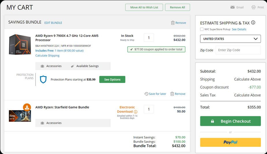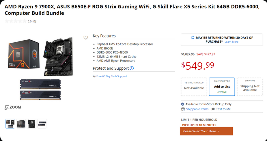 Microcenter로 이동하면 Ryzen 9 7950X, Ryzen 9 7900X3D 및 Ryzen 7 7800X3D와 같은 상위 3개 칩과 호환되는 AM5 마더보드를 구입할 때 동일한 혜택과 추가로 미화 20달러 할인을 받을 수 있습니다. Ryzen 9 7900X는 ASUS B650E-F ROG STRIX Gaming WIFI 마더보드와 한 쌍의 G.Skill Flare X5 시리즈(32GB DDR5-6000) 메모리 키트를 미화 120달러에 구입할 수 있는 번들로 추가로 제공 됩니다 . 이러한 구성 요소는 별도로 구매하는 경우 미화 500달러입니다. 또한 Microcenter 및 나머지 소매업체가 나열한 모든 거래는 Starfield 사본을 받을 수 있습니다( 자세한 내용은 여기 참조 ).