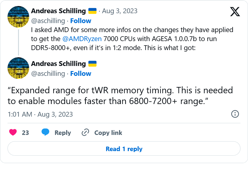 또한 AGESA 1.0.0.7b의 tWR 타이밍이 확장되어 더 느슨한 타이밍이 가능합니다. 분명히 tWR은 1.0.0.7b가 나오기 전에 제한되어 AM5 플랫폼의 메모리 주파수 범위를 방해하는 느슨한 타이밍을 방지했습니다.