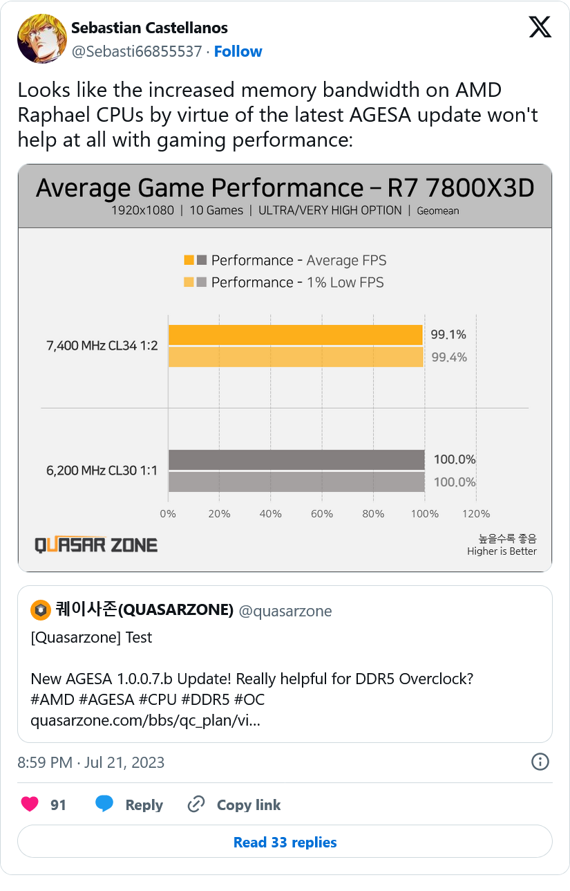 이 추가 주파수 헤드룸의 유일한 문제는 게임 성능을 향상시키는 데 거의 또는 전혀 도움이 되지 않는다는 것입니다. 일부 테스트에서는 DDR5-7400 메모리에서 실행하면 DDR5-6200보다 1% 더 나쁜 성능을 제공하는 것으로 나타났습니다. 이는 상호 연결이 높은 메모리 주파수를 실행하지 못하도록 하는 Ryzen의 악명 높은 무한 패브릭 제한 때문입니다. Ryzen 7000에서 6000-6400 이상의 DDR5 메모리를 실행하려면 메모리 하위 시스템이 FCLK, UCLK 및 MCLK를 1:1:2 비율(1:1:1 대신)로 실행해야 메모리 대기 시간이 증가합니다.