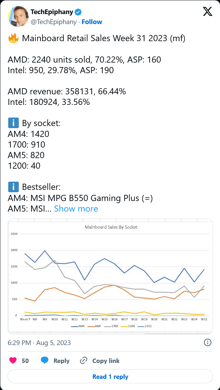5800X3D는 시장에서 최고의 게임 칩 중 하나였으며 여전히 남아 있지만 7800X3D는 인텔의 주력 제품을 능가하는 성능과 일반적으로 미화 400달러에 가까운 가격으로 차선책입니다. 마더보드 판매의 경우 AM4 할인으로 인해 1420개의 마더보드가 판매되어 소매업체에서 가장 잘 팔리는 시리즈가 되었지만 Intel의 LGA 1700 소켓 보드도 910개가 판매되어 상승세를 보였습니다. AM5는 지난주보다 급격히 증가한 820대를 밀었습니다.