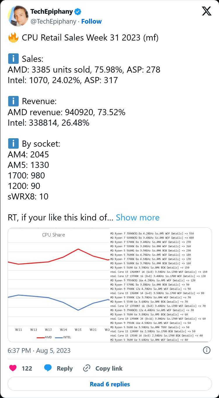Intel이 클라이언트 시장 점유율 부문에서 증가한 반면 AMD는 점유율과 수익 모두 에서 감소한 데에는 이유가 있습니다 . 그러나 그럼에도 불구하고 AMD의 Ryzen 7 3D V-Cache 부품은 미쳤고 미국 독점 5600X3D 는 AM4 사용자에게 AM5로 업그레이드하는 대신 플랫폼을 고수할 또 다른 변명을 제공하는 또 다른 칩일 뿐입니다.