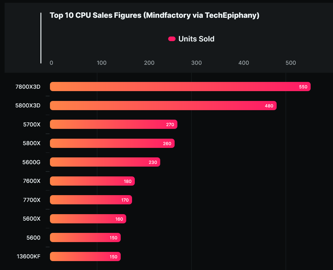 출처 : https://wccftech.com/amd-ryzen-7-7800x3d-5800x3d-3d-v-cache-cpus-crush-it-in-sales-at-mindfactory/
