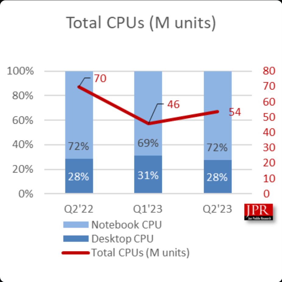 Jon Peddie Research가 게시한 최신 통계에서 PC 클라이언트 CPU 장치는 2023년 2분기에 5,360만 개에 도달하여 이전 분기보다 17% 증가했으며 iGPU 출하량은 14%(4,900만 개) 증가했습니다. 노트북 시장은 72%의 점유율로 압도적인 우위를 보였고 데스크탑 CPU 출하량은 전 분기보다 약간 감소한 28%를 기록했습니다.